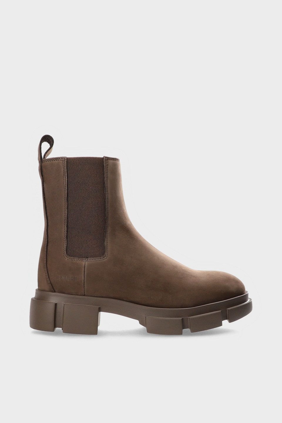 In Chocolate. Chelsea Boots aus weichem Nubukleder. Knöchelhohe Chelsea-Silhouette. Runde Kappe. Elastische Seiteneinsätze. Zugschlaufe am Schaft. Goldfarbenes Logo an der Außenseite. Ein ausdrucksstarker und zugleich minimalistischer Style.