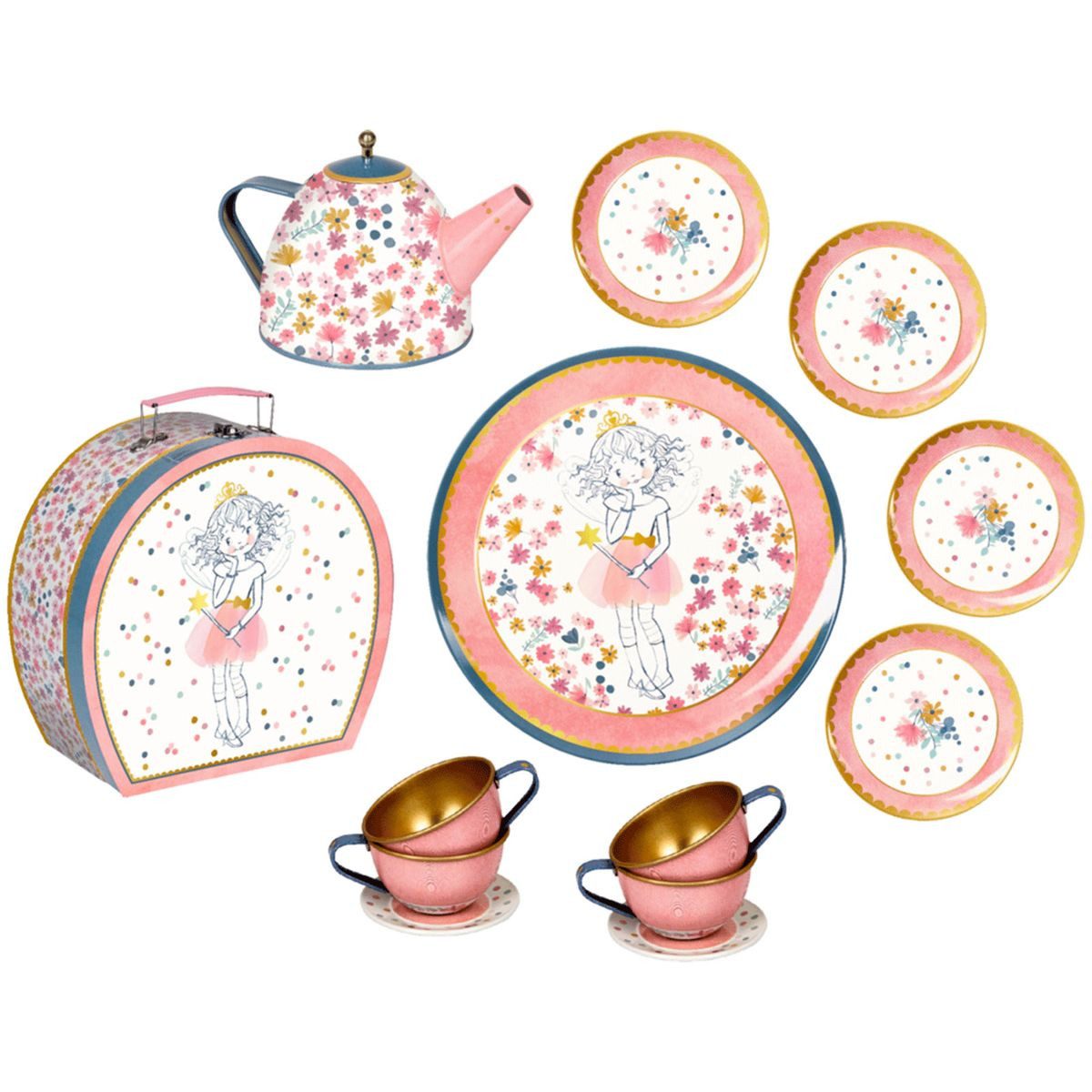 Mit 4 Tellern und 4 Tassen sowie einer Kanne mit Deckel ist der Tisch für Freunde, Kuscheltiere und alle anderen Gäste perfekt gedeckt.