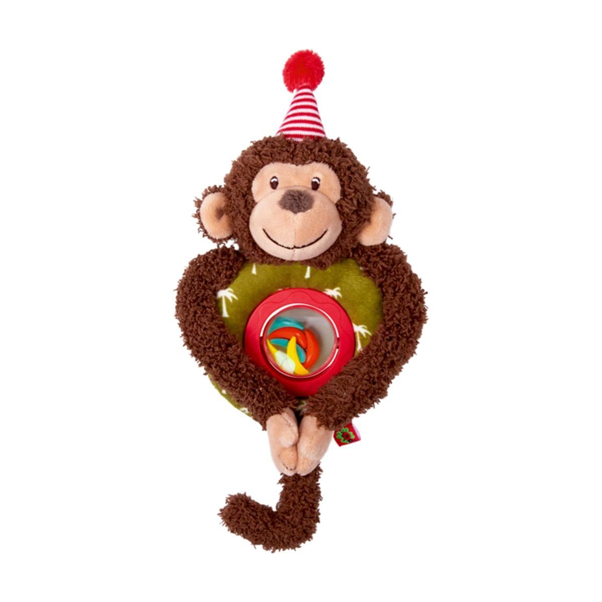 Dieses kleine Äffchen begeistert die Kleinsten mit seinen lustig rasselnden bunten Bananen im Bauch. Dank der Magneten an den Händen kann der Rassel-Affe ganz einfach an Maxi-Cosi und Co befestigt werden. Mit Stickerei.