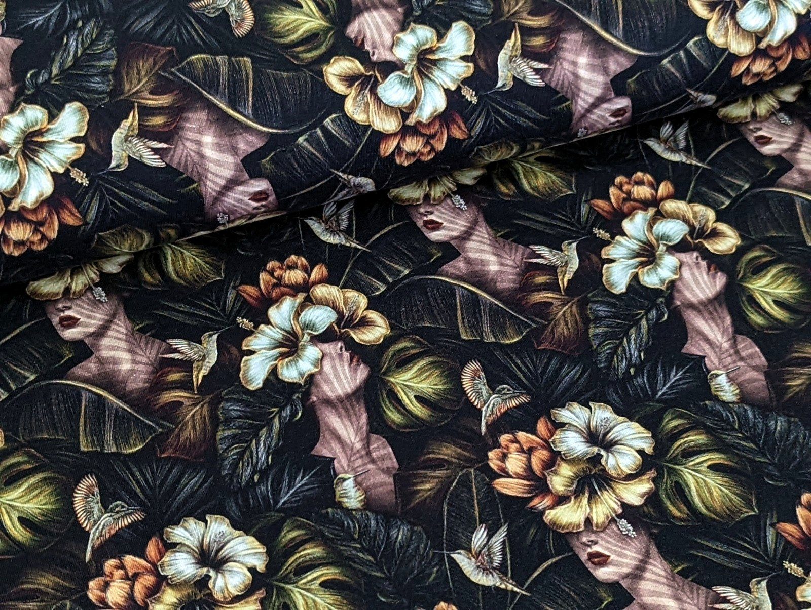 Stoff Baumwolljersey Elegante Frau mit Blumenschmuck Schwarz Stoff