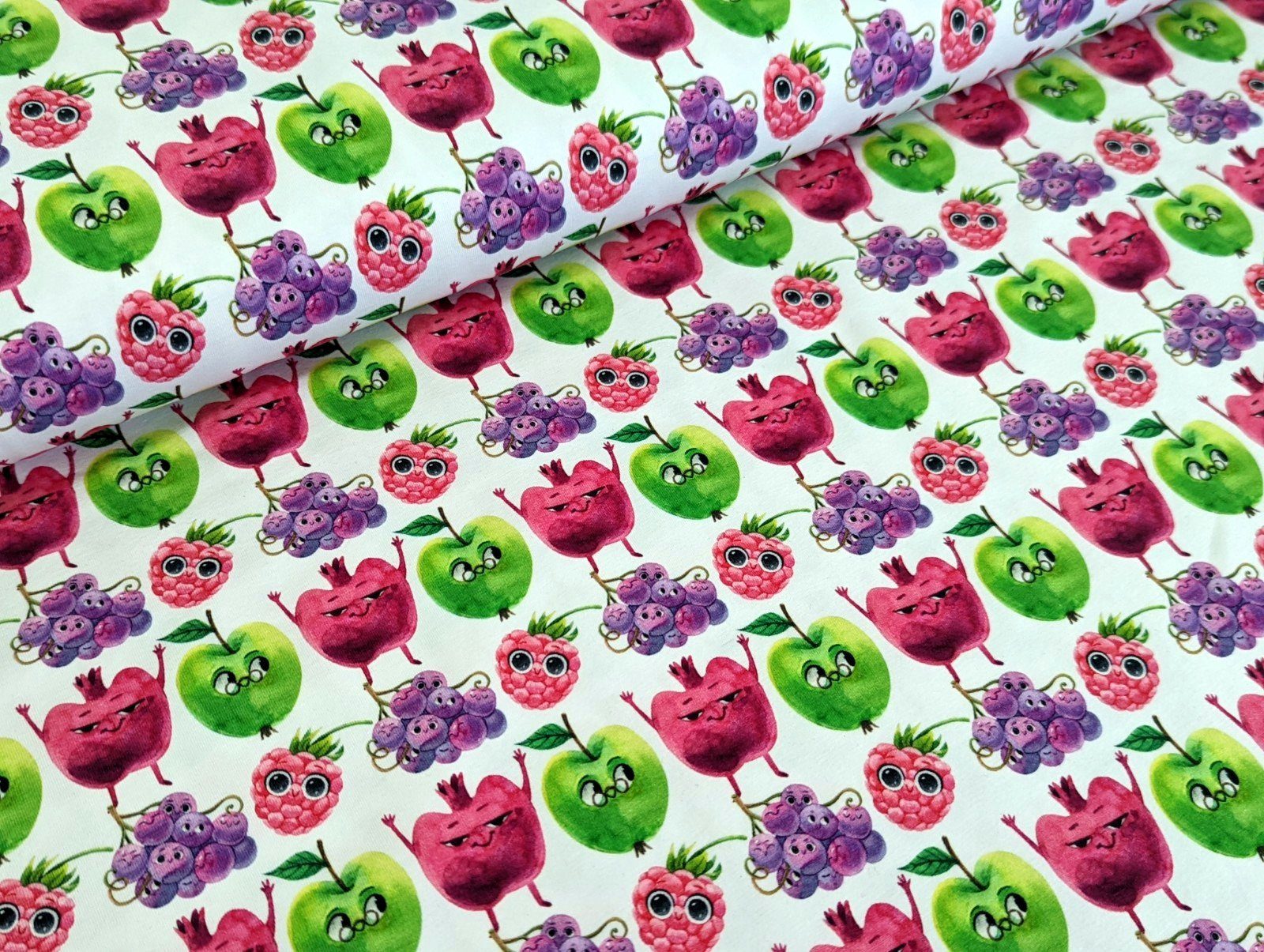 Corileo Stoff Baumwolljersey Freche Früchte auf Weiß Stoff Meterware Jersey