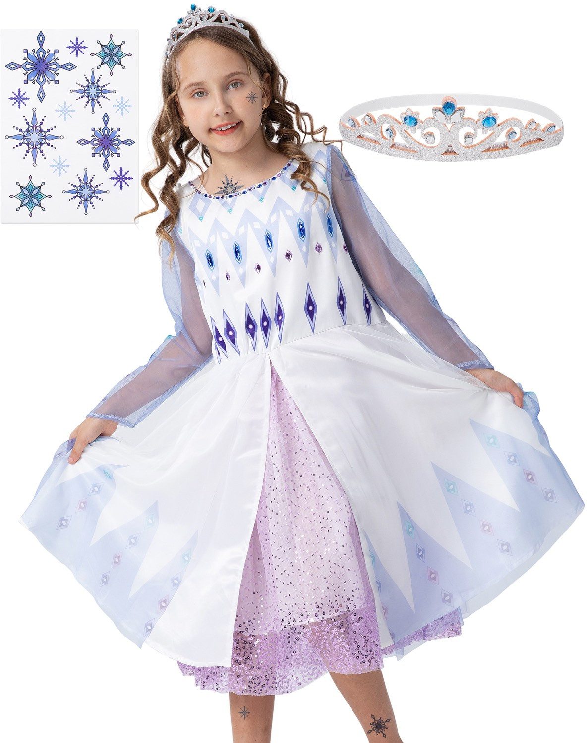 PRAKTISCH UND SICHER: Der elegante weiße Umhang ist mit Druckknöpfen an der Schulterpartie des Kleids befestigt und kann ganz einfach abgenommen werden. Außerdem ist das dazugehörige Diadem nicht aus Metall, sondern aus Schaumstoff. Es tut also nicht weh am Kopf und passt sich perfekt jedem Kinderkopf an.