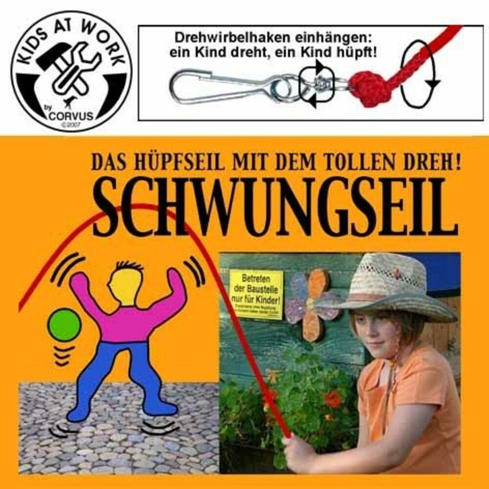 Ein Schwungseil mit Drehwirbelhaken. Dieser wird an einer stabilen Stelle eingehängt, ein Kind dreht, die anderen hüpfen. Der Drehwirbel verhindert das Verdrehen des Seils. Tolles Sportgerät auch für Schule und Kindergarten und natürlich für zu Hause. Gut für die Koordination, Bewegungsabläufe, Geschicklichkeit und die Ausdauer.