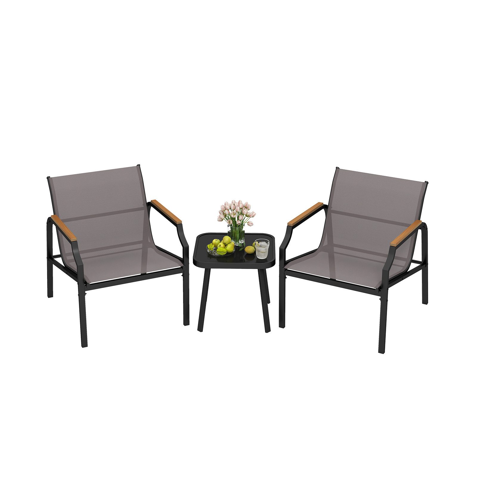 Verleihen Sie Ihrem Außenbereich mit diesem robusten und stilvollen 3-teiligen Outdoor-Stuhl- und Tischset ein Upgrade. Hergestellt aus hochwertigen Metallrohren, bietet das Set langanhaltende Stabilität und Halt. Die Stühle verfügen über einen 54 cm breiten Sitz mit ergonomischen Konturen und Holz-Kunststoff-Armlehnen für erhöhten Komfort. Zudem besitzt der elegante quadratische Couchtisch eine Sicherheitsglasplatte, ideal für Getränke und Snacks. Dieses Bistro-Set eignet sich perfekt für Balkon, Veranda oder Garten und verspricht, Ihren Außenbereich in ein Paradies für Entspannung und anregende Gespräche zu verwandeln.