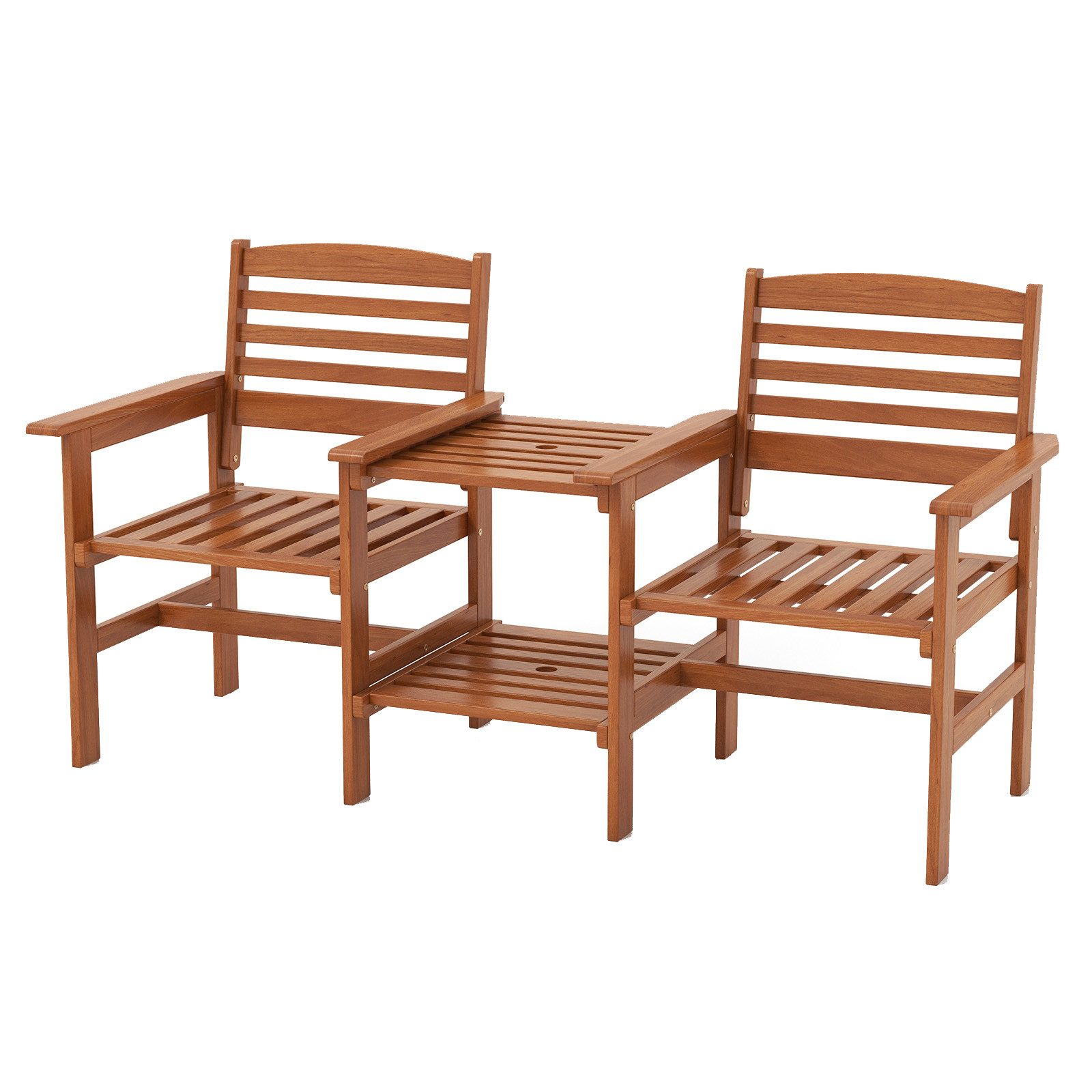 Dieses sorgfältig aus robustem Holz gefertigte Sitzmöbelset für den Außenbereich ist langlebig und strapazierfähig. Die wasserfeste Oberfläche ist pflegeleicht und somit eine dauerhafte Ergänzung für Ihren Außenbereich. Das gemütliche 2-Sitzer-Stuhlset ist ideal zum Entspannen und verfügt über einen Mitteltisch zur praktischen Aufbewahrung wichtiger Dinge wie Getränke, Snacks oder Lesematerial. Das integrierte Schirmloch des Tisches ermöglicht schattige Entspannung an sonnigen Tagen. Die ergonomische Rückenlehne und die verbreiterten Armlehnen erhöhen den Komfort bei längeren Entspannungsphasen.