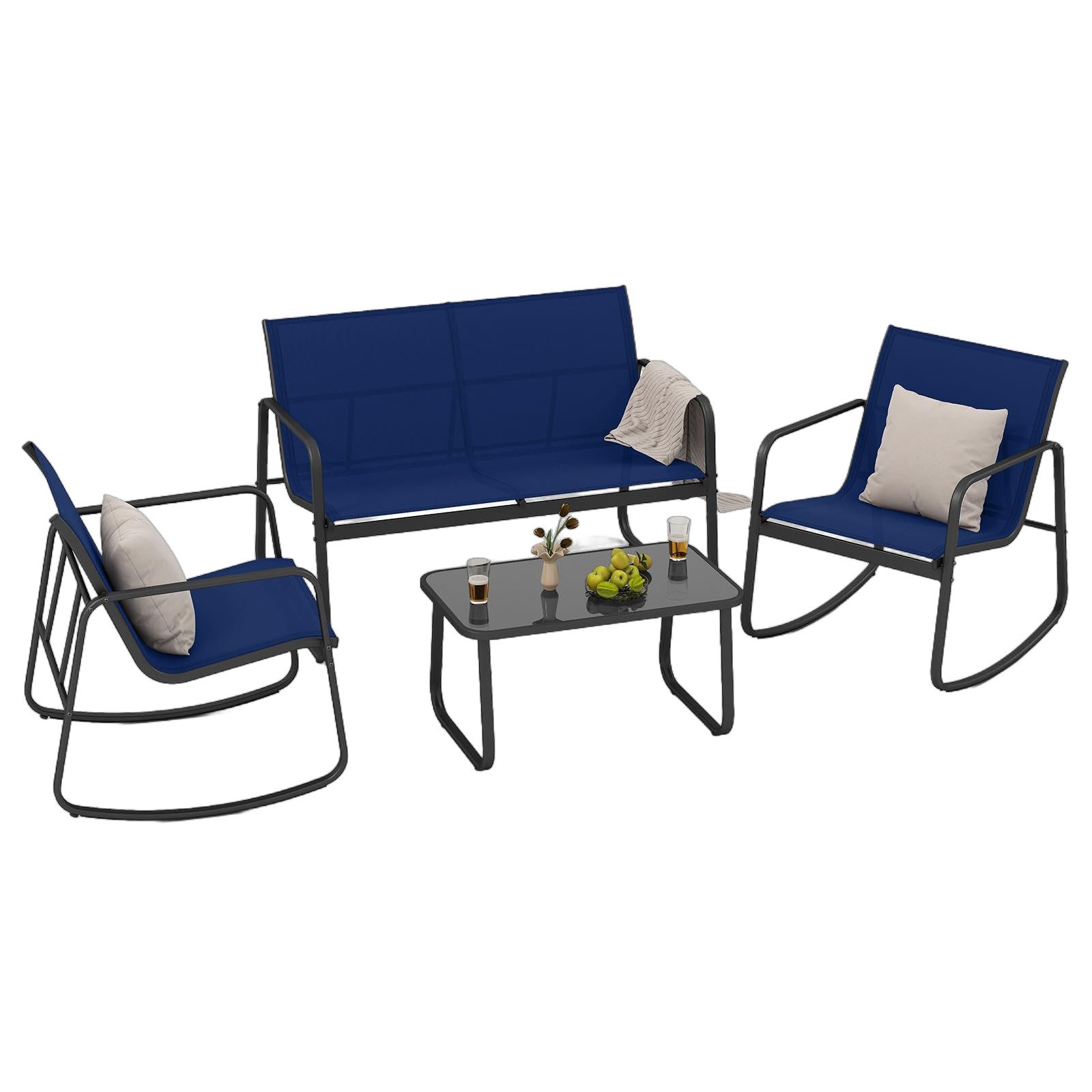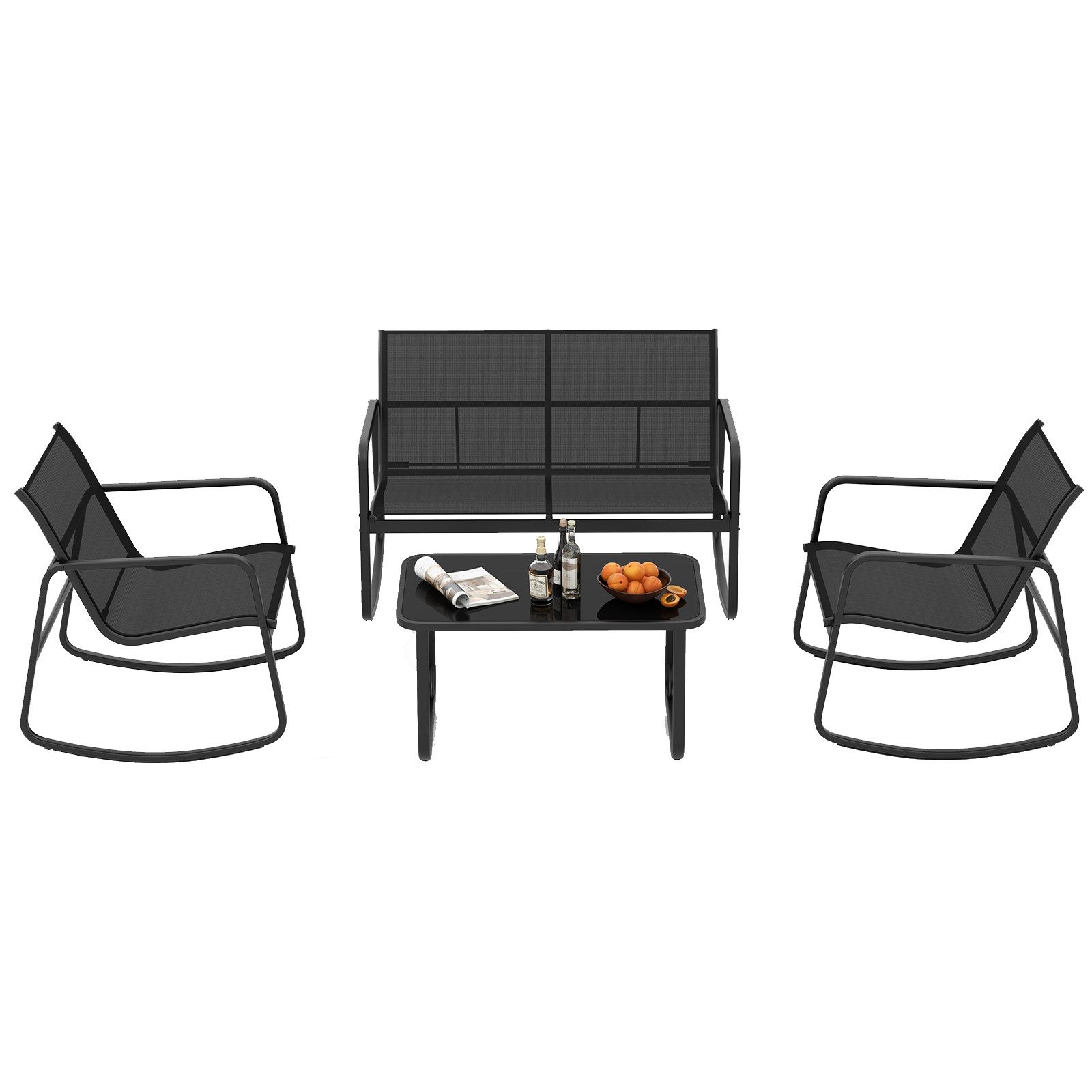 Dank der stabilen Basis mit rutschfesten Gummimatten und verstellbaren Stoppern sorgt jeder Stuhl für eine sanfte Schaukelbewegung. Und auch der ergonomische Sitz bietet Ihnen ultimativen Komfort. Der Sitzstoff wurde verbessert, um sowohl Komfort als auch Haltbarkeit zu gewährleisten und gleichzeitig atmungsaktiv und schnell trocknend zu sein. Darüber hinaus bieten sowohl der Tisch als auch die Schaukelstühle und das Zweiersofa dank der stabilen Metallstruktur zuverlässigen Halt und sind rostbeständig. Und die elegante Tischplatte aus gehärtetem Glas des Gartentisches verleiht einen Hauch von Raffinesse und wird durch 4 Saugnäpfe fest fixiert. Ob in Ihrem Garten, am Pool oder auf Ihrem Balkon, dieses Set verspricht eine sichere und robuste Option zum Entspannen im Freien. Lehnen Sie sich zurück, entspannen Sie sich und genießen Sie Komfort und Leichtigkeit mit diesem 4-teiligen Bistro-Set mit Schaukelfunktion.