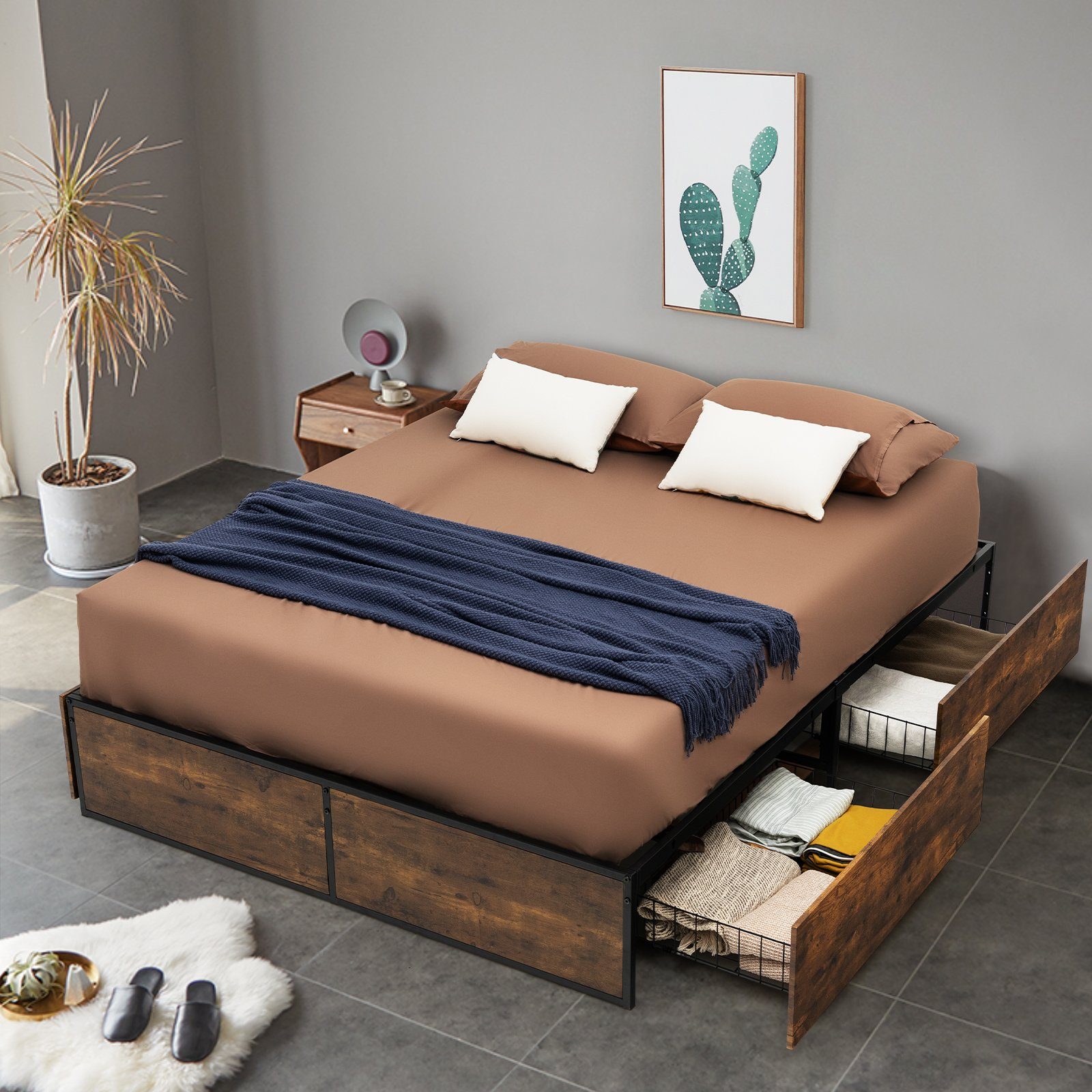 Unser Bettgestell aus Metall dient nicht nur zur Auflage einer Matratze, sondern bietet Ihnen auch eine angenehme Ruhezone. Sein gesamter Rahmen besteht aus beschichtetem Metall, wodurch die Tragfähigkeit des Bettes auf 300 kg und die jeder Schublade auf 10 kg erhöht wird. Ein Kopfteil ist nicht im Lieferumfang enthalten. Der Bettrahmen ist jedoch mit zusätzlichen Löchern für Ihr eigenes Kopfteil ausgestattet. Und es kommt mit einem industriellen Fußbrett aus Holz. Unter dem Bett befinden sich 4 Schubladen mit PV-Rollen für Ihre Kleidung, Bettwäsche, Spielzeug, Bücher usw. Darüber hinaus gibt es weitere Details für Personen mit leichtem Schlaf. EVA-Dämpferstangen helfen, Geräusche zu reduzieren, und 6 h-förmige Teile sorgen für Stabilität der Matratze. Mit einer einfachen Montage erhalten Sie einen stabilen Bettrahmen aus Metall mit Schutzpolstern.