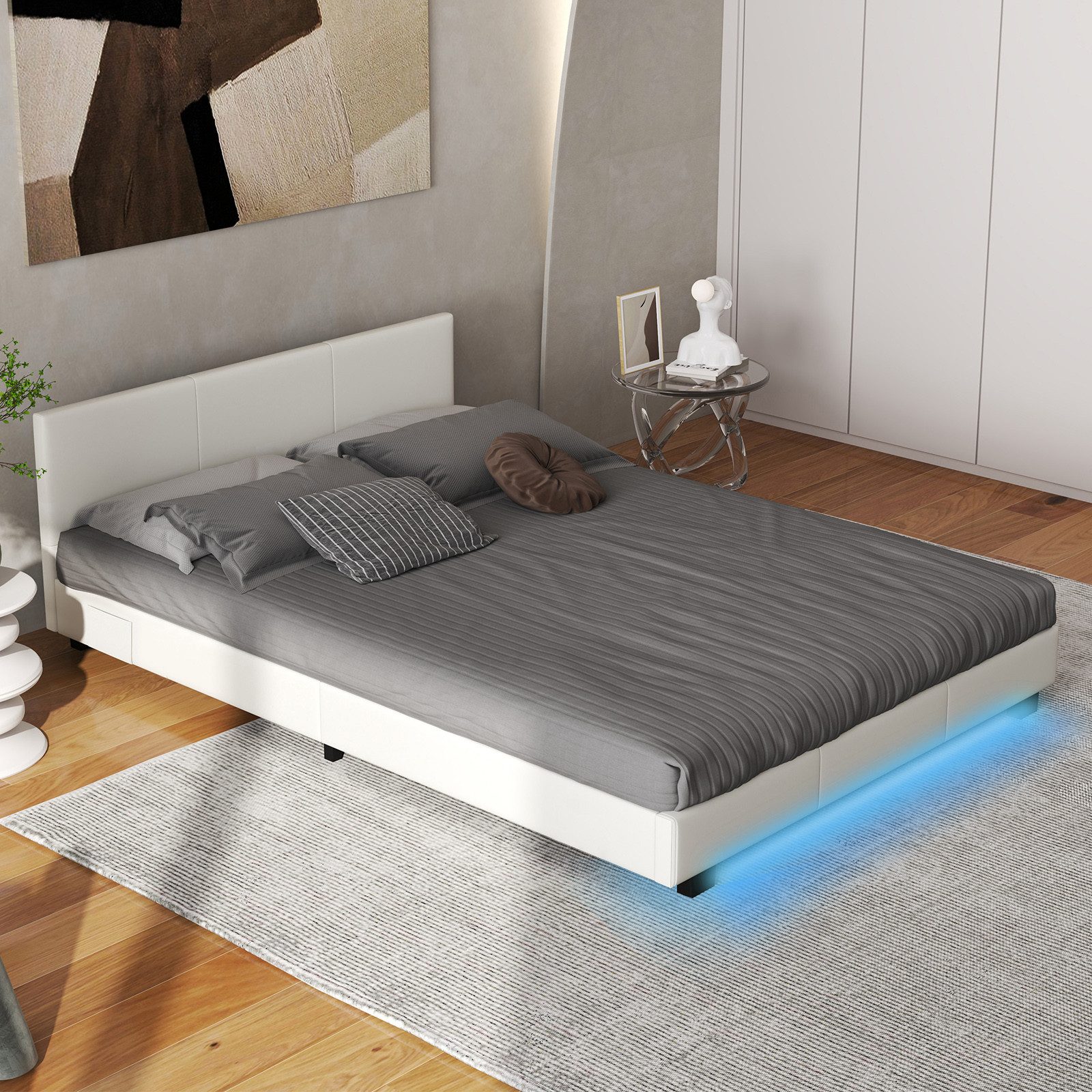 Mit atemberaubenden roten, grünen und blauen LED-Leuchten mit 16 Farben und 4 dynamischen Modi können Sie den Lichteffekt per Fernbedienung anpassen, um die Atmosphäre Ihres Zimmers zu gestalten. Es ist in luxuriöses PU-Leder mit weicher Schaumstoffpolsterung gehüllt und bietet unvergleichlichen Komfort und eleganten Stil. Das Bettgestell wird von robusten Sperrholzlatten getragen, die bequem eine Standardmatratze in Doppelbettgröße halten, ohne dass ein Boxspringbett erforderlich ist. Für mehr Stabilität ist die Massivholzstruktur mit fünf zusätzlichen Metallbeinen verstärkt, sodass sie problemlos erhebliches Gewicht tragen kann. Verleihen Sie Ihrem Schlafzimmer mit diesem Plattformbettrahmen mit LED-Licht einen Hauch moderner Eleganz!