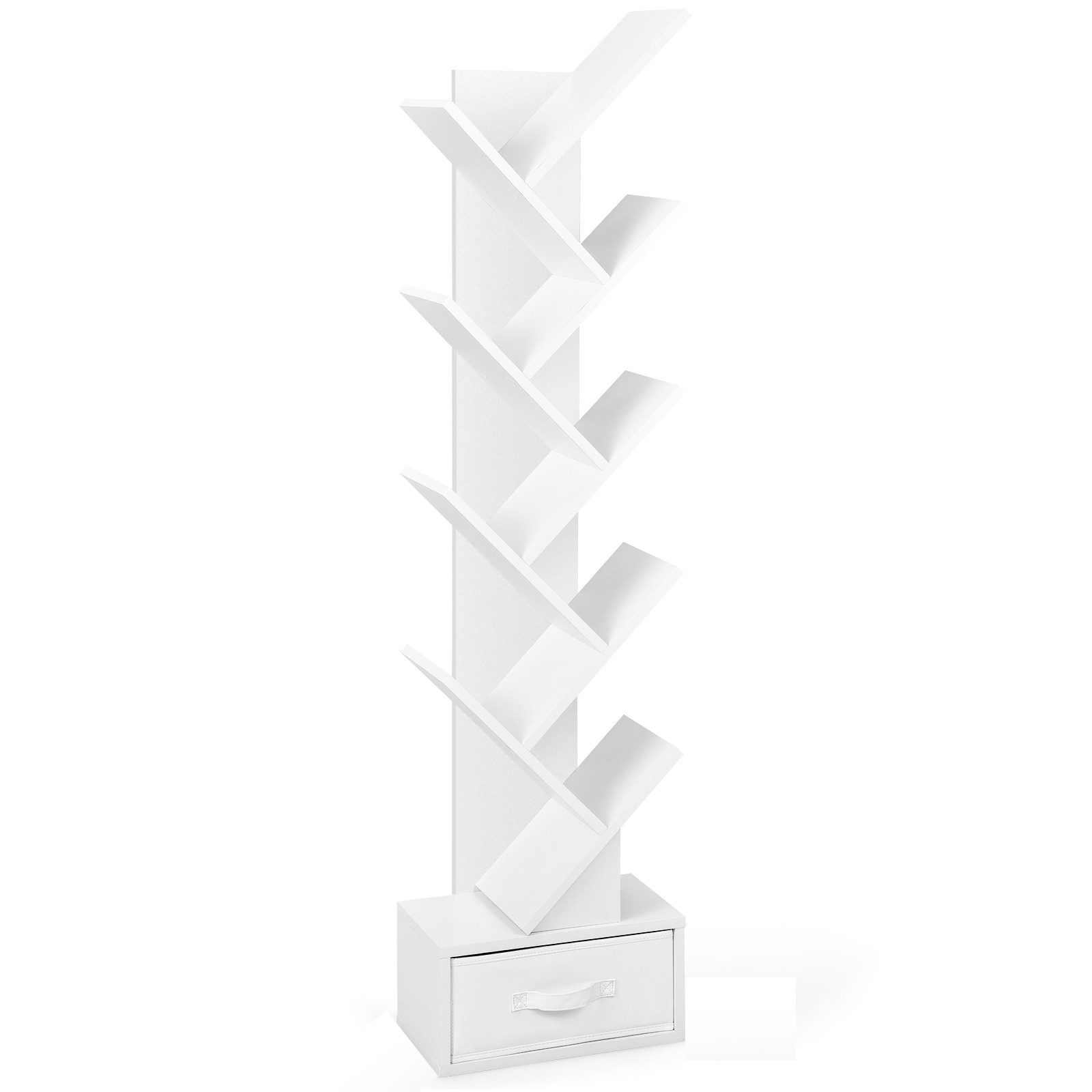 Unser Baum-Bücherregal bietet viel Stauraum und nimmt wenig Platz ein! Das wie ein Baum gestaltete Bücherregal mit den Maßen 38 x 21,5 x 149,5 cm belebt Ihr Zuhause und zieht die Aufmerksamkeit der Gäste auf sich. Es gibt insgesamt 8 Regale und eine Stoffschublade, in denen Bücher und Kleinigkeiten ordentlich untergebracht werden können. Außerdem kann die Schublade für ein weiteres offenes Regal zur Dekorationsausstellung entfernt werden. Aus Sicherheitsgründen ist das Baum-Bücherregal aus hochwertigen Materialien gefertigt, sodass es eine perfekte Stabilität und Belastbarkeit aufweist. Zusammen mit einer Kippsicherung ergibt sich eine hervorragende Stabilität. Sie können es im Schlafzimmer, Wohnzimmer, Eingangsbereich und Arbeitszimmer platzieren. Das kompakte Standregal passt perfekt in eine schmale Ecke.