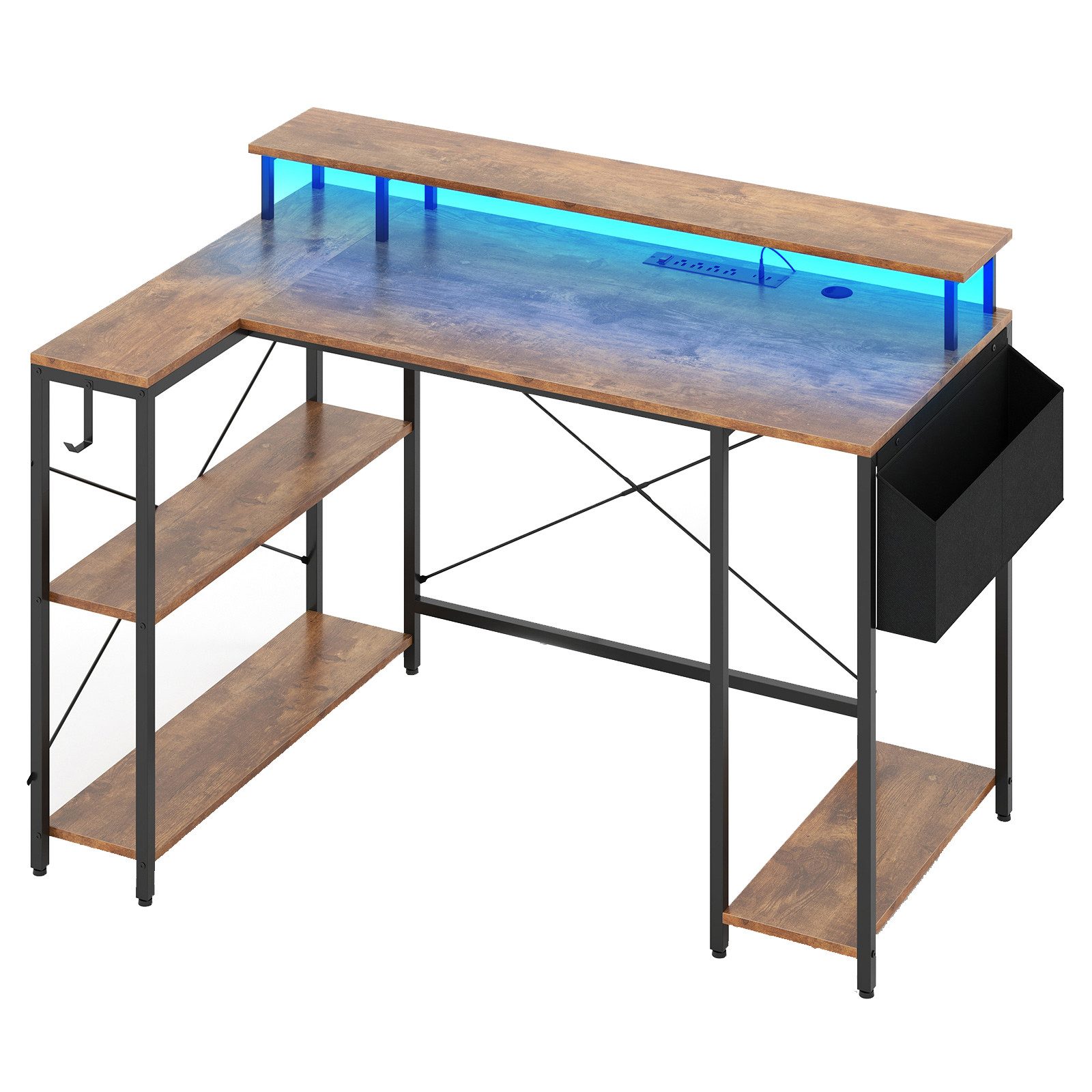 Unser L-förmiger Computer-Schreibtisch beleuchtet Ihren Arbeitsplatz und verbessert Ihr Gaming-Erlebnis mit einem einstellbaren LED-Licht über die Fernbedienung. Integrierte Steckdosen halten verschiedene Geräte mit Strom und sorgen für Ordnung. Die große Arbeitsfläche und der ergonomische Monitorständer organisieren Ihren Bereich und verbessern den Betrachtungskomfort. Mit einem 2-stufigen Aufbewahrungsregal, Kopfhörerhaken, Stofftasche und CPU-Ständer bieten einfache Zugänglichkeit zu wichtigen Gaming- oder Büromaterialien.