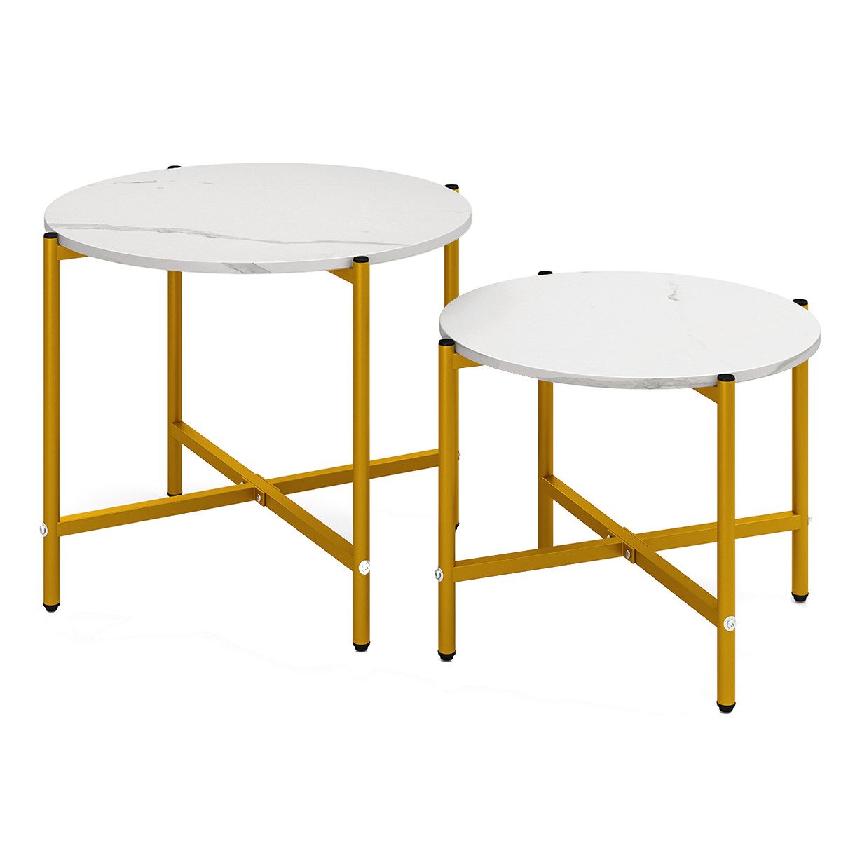 Entdecken Sie das Geheimnis eines schön organisierten und stilvollen Couchtisch Sets! Dieses Set enthält 2 Tische in unterschiedlichen Größen, um verschiedenen Bedürfnissen und Räumen gerecht zu werden. Der größere Tisch kann als zentraler Couchtisch verwendet werden, während der kleinere Tisch perfekt daneben passt oder separat als Beistelltisch genutzt werden kann, um flexible Optionen zur Dekoration Ihres Raumes zu bieten. Jeder Tisch wird von einem robusten, kreuzförmigen Metallrahmen gestützt, der Stabilität und Robustheit gewährleistet.