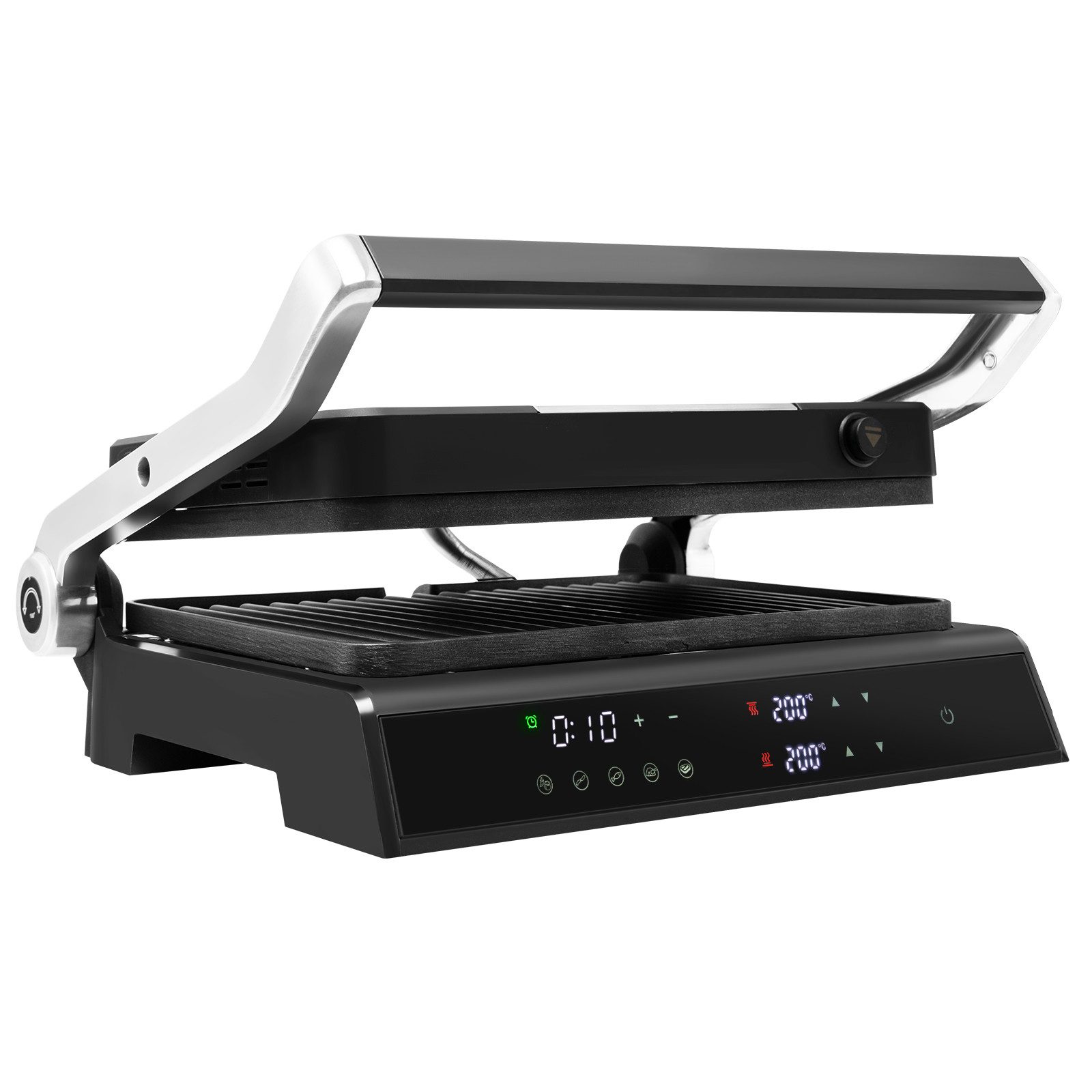 Genießen Sie köstliche Speisen mit Ihrer Familie mit diesem 3-in-1-Elektrogrill! Ausgestattet mit 2 großen Grillplatten und einem um 180° verstellbaren Deckel kann dieser Panini-Pressgrill eine Vielzahl von Speisen aufnehmen und zubereiten, wie z. B. Sandwiches, Paninis, Hühnchen, Gemüse, Fisch, Rindersteaks und so weiter. Die Heiztemperatur der oberen und unteren Grillplatte kann unabhängig voneinander eingestellt werden, um unterschiedlichen Kochanforderungen gerecht zu werden. Außerdem sind die Grillplatten antihaftbeschichtet, abnehmbar und können in der Spülmaschine gereinigt werden. Die Tropfschale ist zur einfachen Reinigung auch abnehmbar.