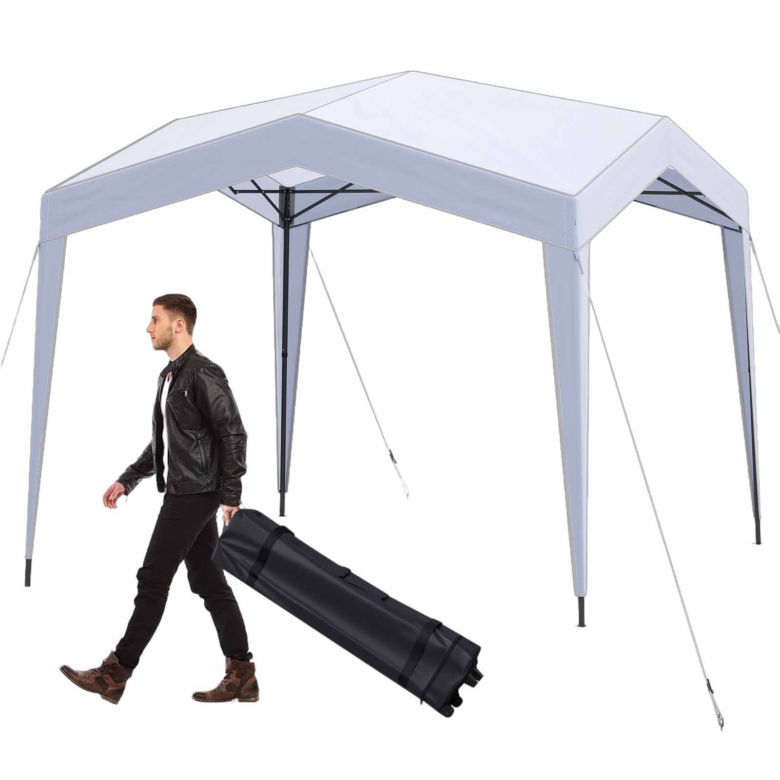 Unser Pop-up Pavillonzelt misst 302 x 302 x 265-375 cm (L x B x H) und verfügt über 2 einstellbare Höhenpositionen, perfekt für verschiedene Outdoor-Aktivitäten. Die innovative Pop-up-Struktur ermöglicht einen schnellen Aufbau ohne Werkzeug, und wenn es nicht gebraucht wird, kann es einfach zusammengeklappt und in der tragbaren Rolltasche verstaut werden. Darüber hinaus verfügt dieses Zelt über ein robustes Polyesterstoffdach mit einer schützenden Silberbeschichtung, die exzellenten Sonnenschutz bietet (Hinweis: Bitte nicht bei starkem Regen oder bei stark windigen Tagen verwenden). Wir bieten außerdem 8 Bodenheringe und 4 Windseile mit stabilen Truss-Verbindungen und sicheren Verriegelungsmechanismen an den 4 Zeltecken, um sie gegen Wetterherausforderungen verlässlich zu machen. Unser Pavillonzelt ist Ihre Allround-Lösung für alle Ihre Outdoor-Schutzanforderungen.