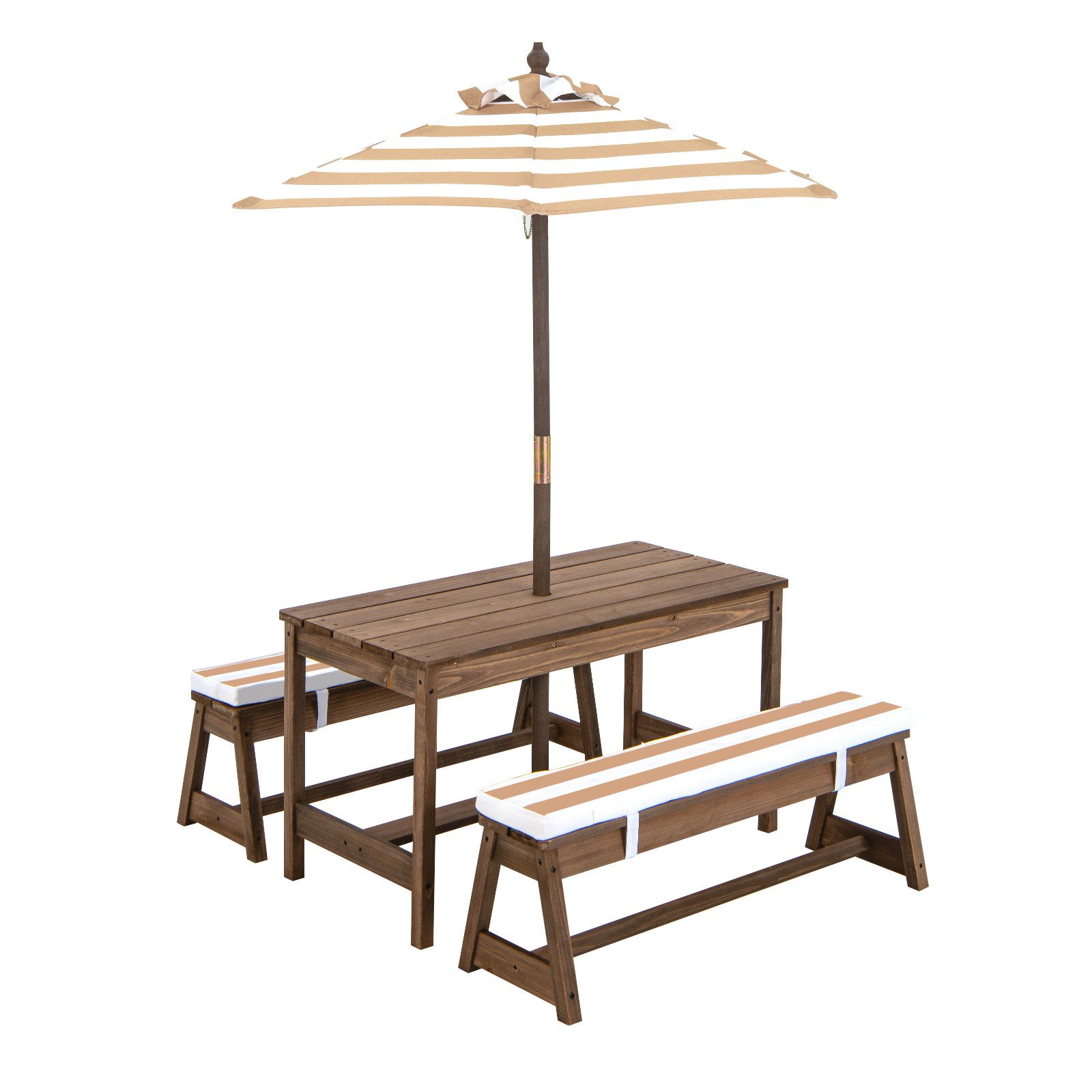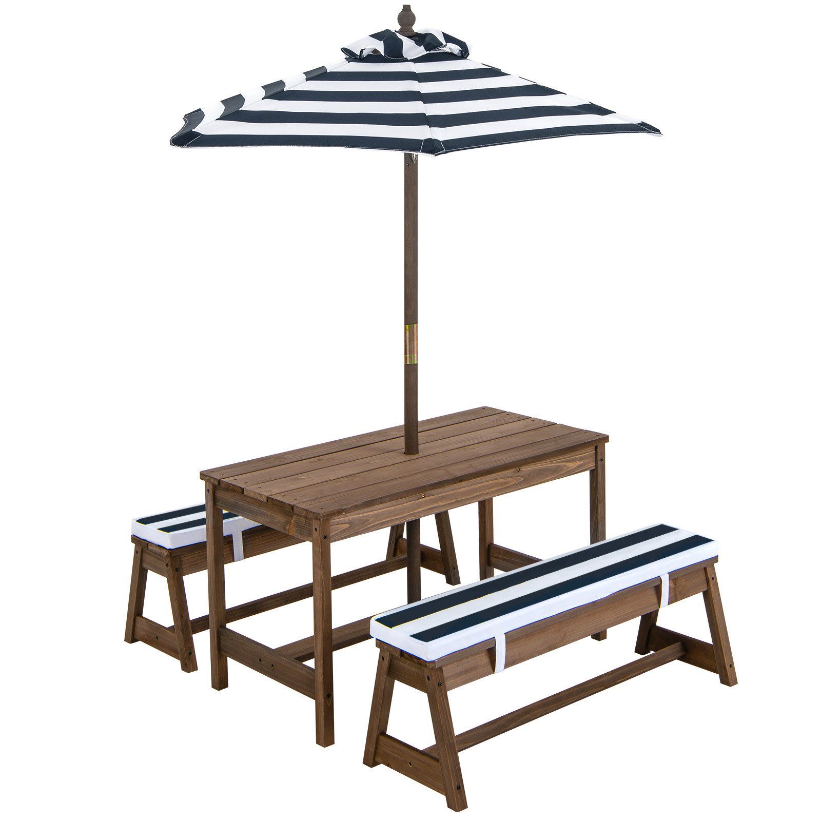 Sie möchten ihren Kindern endlich einen eigenen Bereich im Garten bieten? Dieser Picknicktisch mit Sitzbänken bringt viel Spaß in die Spielzeit Ihres Kindes, sodass sich Ihre Kleinen entspannen, Spiele spielen, essen und mit ihren Freunden basteln können. Das aus einem massiven Tannenholzrahmen gefertigte Picknicktisch-Set zeigt perfekte Leistung in Bezug auf dauerhafte Haltbarkeit und große Tragfähigkeit. Der Sonnenschirm verfügt über 3 verstellbare Höhen, um an heißen Tagen Schatten vor der Sonne zu bieten, und er kann entfernt werden, wenn Ihr Kind es lieber im Haus verwenden möchte. Der geräumige Sitz und die hochelastischen, mit Schwamm gepolsterten Kissen bieten Ihren Kindern ein angenehmes Sitzerlebnis.