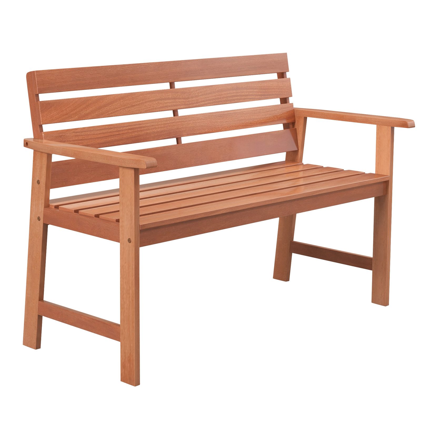 Die aus hochwertigem Hartholz gefertigte Loveseat-Bank ist so konstruiert, dass sie einer Nutzung über einen langen Zeitraum standhält. Und das ergonomische Design mit 102° geneigter Rückenlehne und breiten Armlehnen sorgt für ein angenehmes Sitzgefühl. Mit einer Sitzfläche und Rückenlehne aus Holzlatten bleiben Sie auch bei heißem Wetter kühl. Noch wichtiger ist, dass die verstärkten Querstreben auf beiden Seiten die Stabilität erhöhen. Diese Bank aus Naturholz ist eine fantastische Ergänzung für jeden Außenbereich, z. B. im Hinterhof, auf der Veranda, auf dem Balkon oder am Pool.