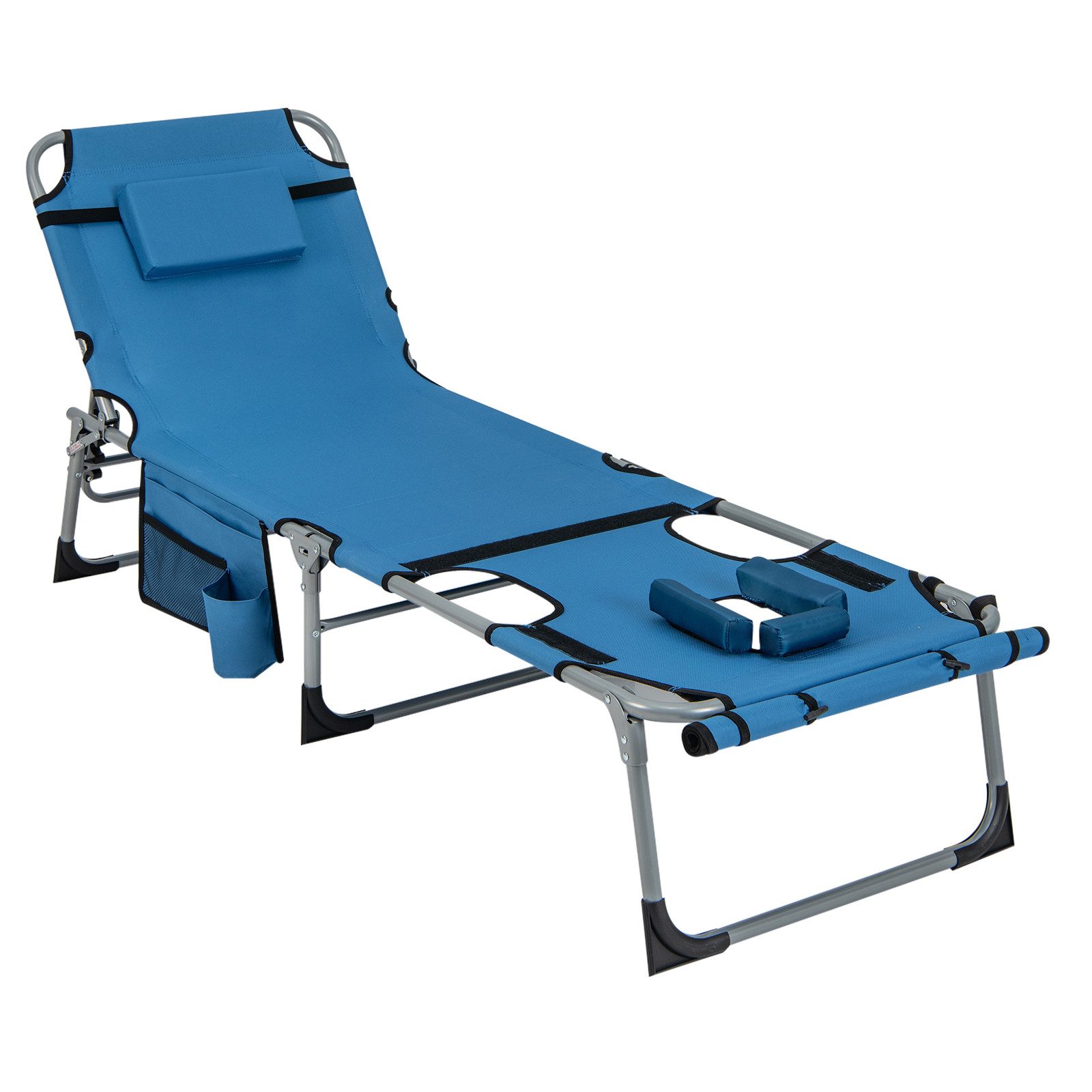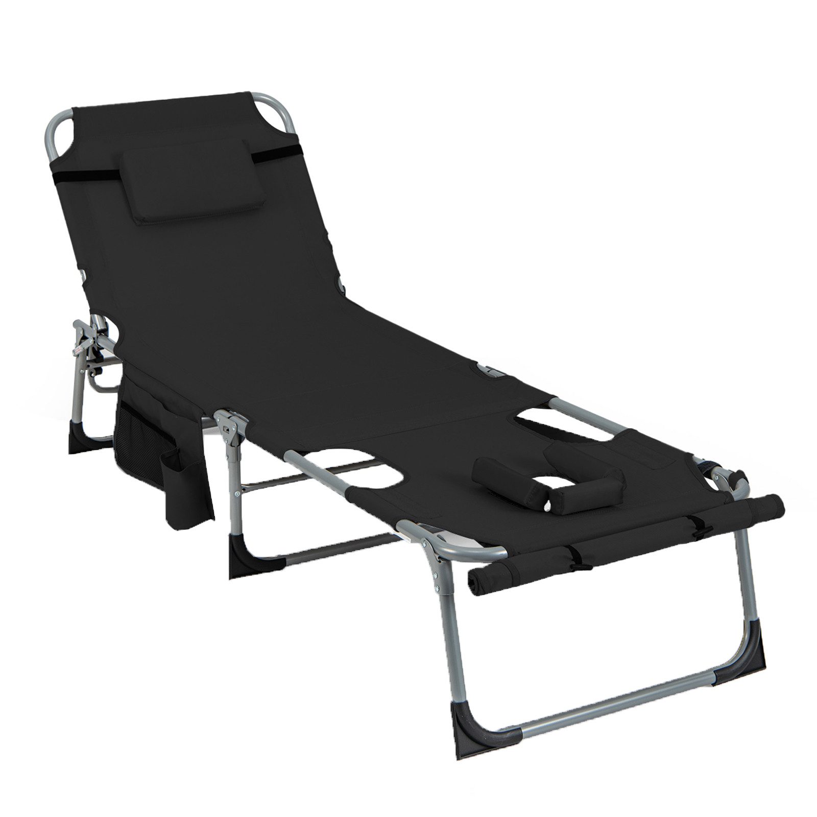 Die Rückseite dieses verstellbaren Liegestuhls hat fünf Positionen und das Fußteil hat zwei Positionen, um vollständig auf Ihre unterschiedlichen Sitzbedürfnisse einzugehen, damit Sie bequem lesen, schlafen oder telefonieren können. Darüber hinaus bietet ein abnehmbarer Kopfstütze komfortable Unterstützung für Ihren Nacken. Wenn Sie sich nach unten legen möchten, können Sie auch Ihren Kopf in das Gesichtsloch legen und Ihre Arme durch die Schlitze auf jeder Seite stecken, um bequem zu lesen. Außerdem kann dieser Strandliegestuhl zum einfachen Verstauen zusammengeklappt werden, wenn er nicht in Gebrauch ist. Oder Sie können ihn überallhin mitnehmen, wie zum Beispiel an den Strand, den Pool oder die Terrasse.