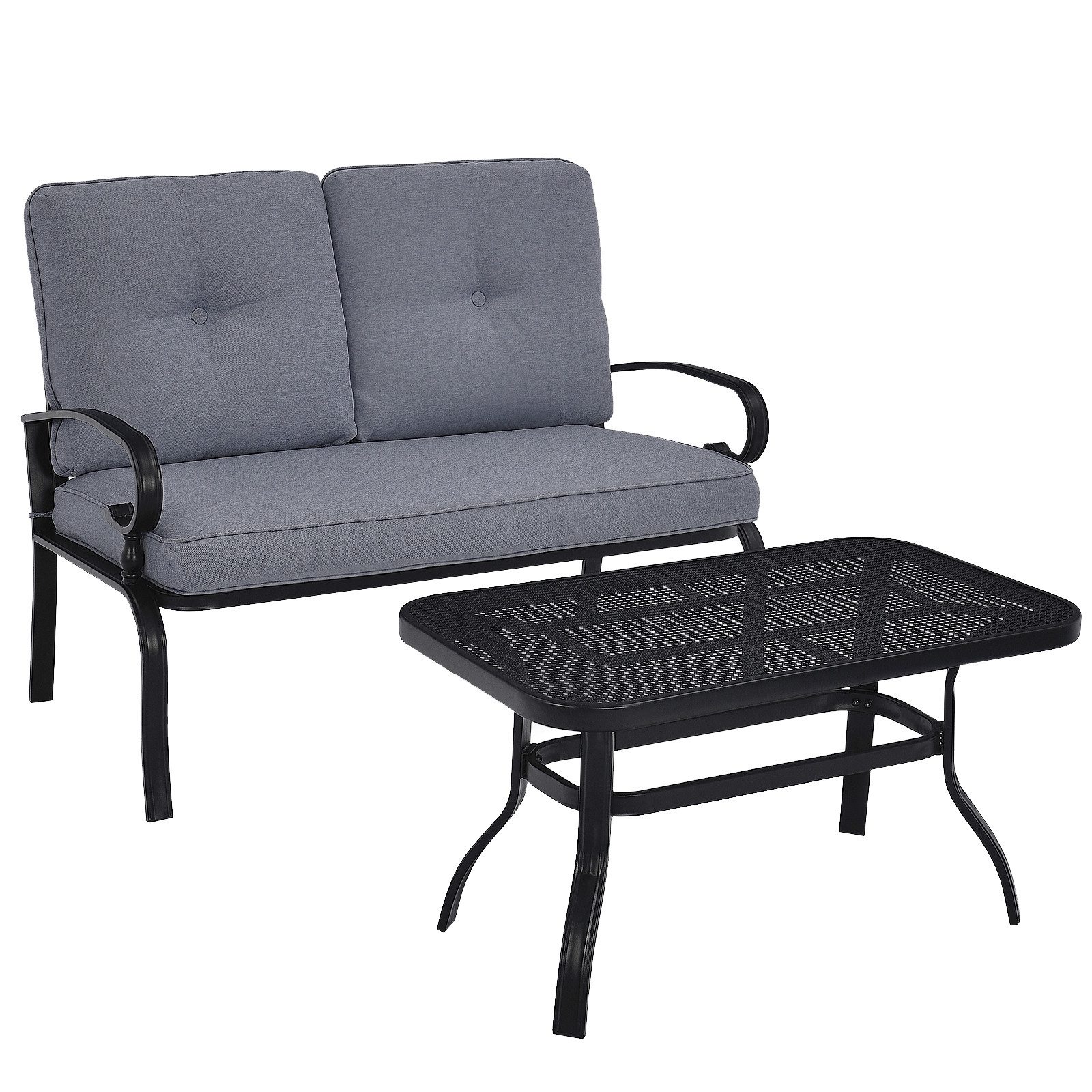 Dieses Outdoor-Gartenbank-Set mit einem Couchtisch besteht hauptsächlich aus rostfreiem Metall für verbesserte Stabilität und höhere Tragfähigkeit. Gleichzeitig ist es mit hochdichten Kissen ausgestattet, die weich und atmungsaktiv sind und Ihnen ein ultraschönes Sitzerlebnis bieten. Terrasse, Garten, Veranda, Balkon... Wo immer Sie sich befinden, mit wem auch immer Sie zusammen sind, es wird Ihnen helfen, ein erfreuliches Leben unter verschiedenen Umständen zu schaffen. Kommen Sie und wählen Sie jetzt die perfekte Wahl!