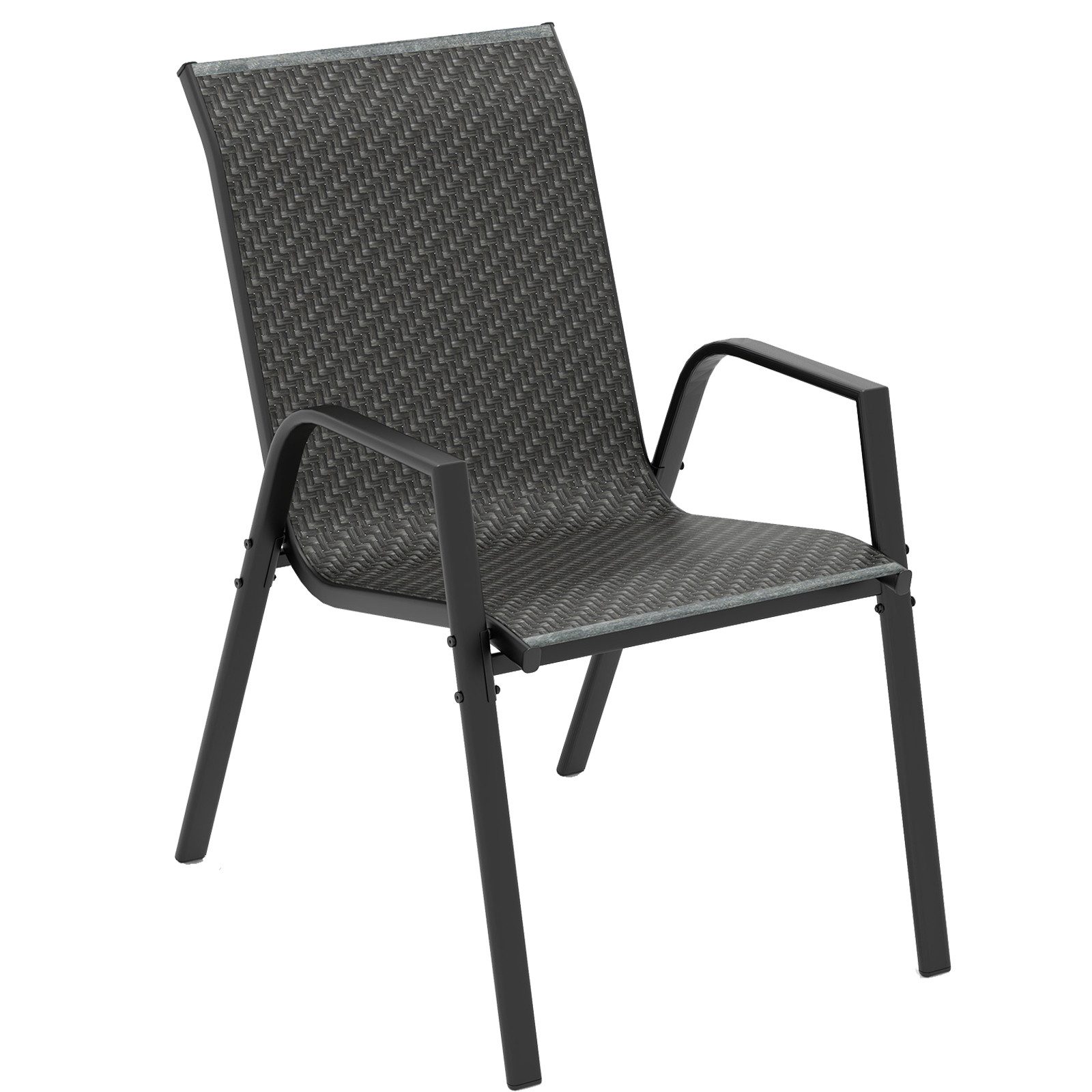 Gefertigt mit hervorragender Handwerkskunst, zeigt der geflochtene Rattansitz dieses Stuhls eine schöne braune Farbe, die zu jeder Außenumgebung passt. Das maschinell geflochtene Rattan sorgt für Langlebigkeit und Farbbeständigkeit. Die stapelbare Funktion ermöglicht eine einfache Lagerung und maximiert den Platz für andere Aktivitäten im Freien. Mit einem robusten Metallrahmen sind diese Stühle rostbeständig und bieten hervorragende Stabilität. Das ergonomische Design bietet optimalen Komfort und macht sie ideal für verschiedene Außenbereiche wie Hinterhof, Poolseite und Veranda. Verbessern Sie Ihre Außenbestuhlung mit diesen 4 vielseitigen und stilvollen Gartenstühlen.