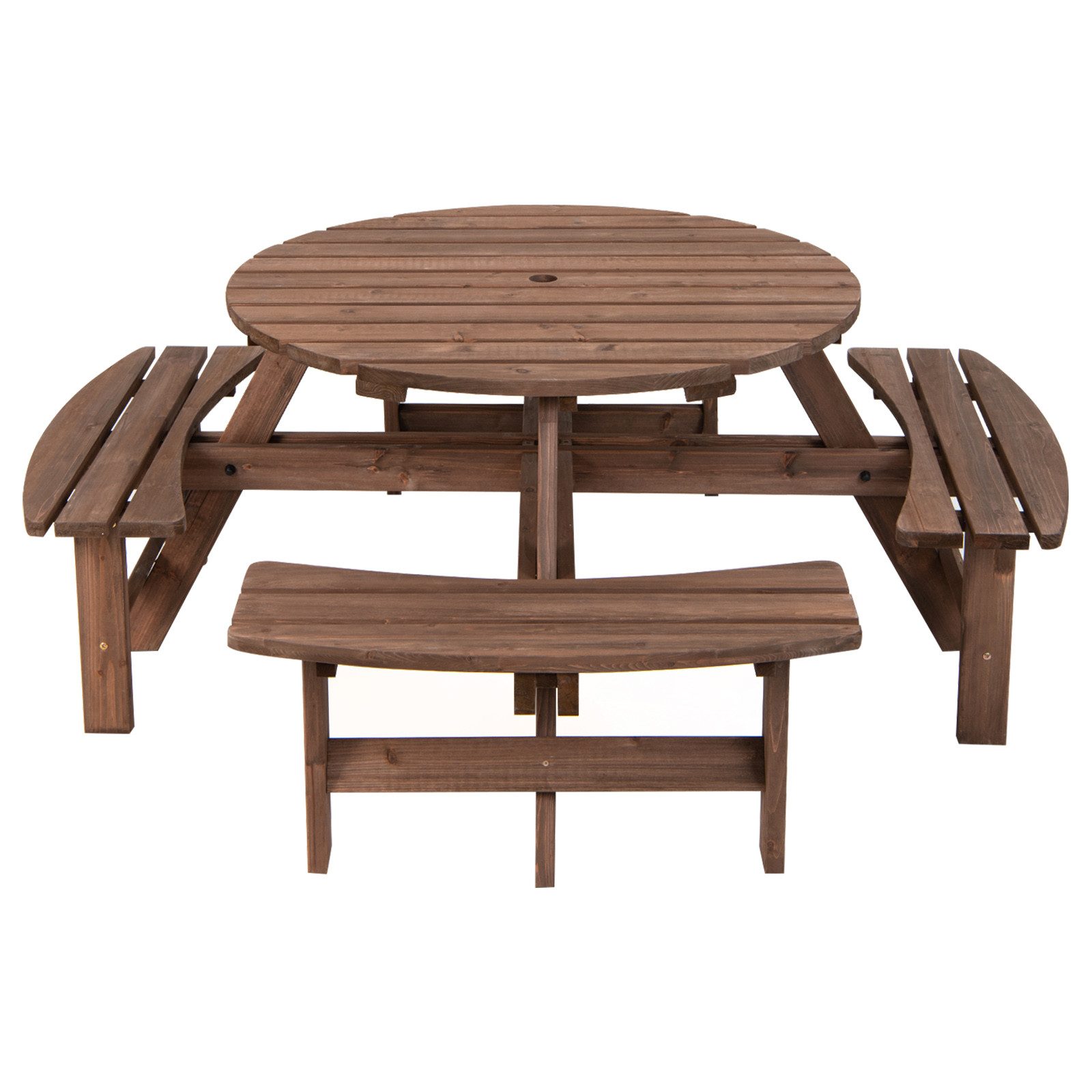 Unser Picknicktisch-Set für 8 Personen im Freien ist mit einem großen Picknicktisch und 4 Bänken ausgestattet, und jede Bank bietet Platz für 2 Personen. Der runde Picknicktisch besteht aus hochwertigem Tannenholz mit exquisiter Polierbehandlung, die langlebig und verformungsbeständig ist und eine lange Lebensdauer gewährleistet. Darüber hinaus ist es mit wasserfester Farbe beschichtet, die schlechtem Wetter widersteht und den Einsatz im Freien ermöglicht. Und in der Mitte des Tisches befindet sich ein Schirmloch, sodass Sie einen Sonnenschirm einsetzen können, um den Bereich vor schädlichen Sonnenstrahlen zu schützen. Abgesehen davon fühlen Sie sich dank der ergonomischen Sitze nach langem Sitzen nicht müde. Der Gartentisch eignet sich für Aktivitäten im Freien und verleiht Ihrem Außenbereich einen rustikalen Charme.