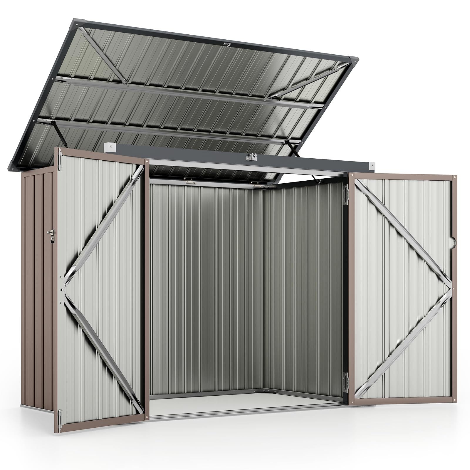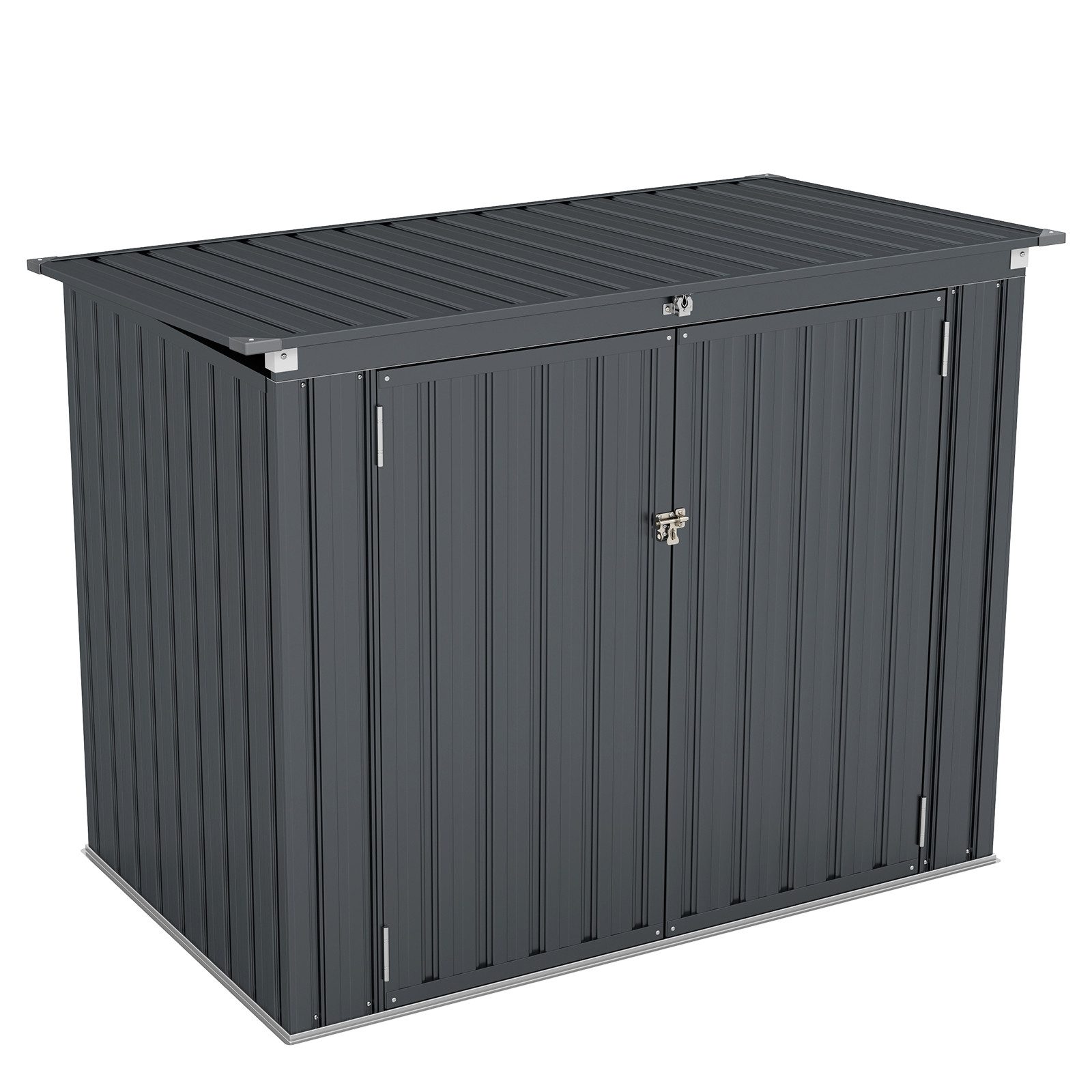 Suchen Sie nach einer praktischen Aufbewahrungslösung für Ihren Außenbereich? Unser Gartenschuppen ist mit einem doppelten Öffnungssystem ausgestattet und verfügt über einen oberen Klappdeckel, der von hochwertigen Gasstangen für einfachen Zugang unterstützt wird. Die 2 zu öffnenden Türen bieten zusätzliche Flexibilität und machen ihn ideal für verschiedene Szenarien, darunter Gärten, Poolbereiche und Hinterhöfe. Für mehr Komfort ist dieser Gartenschuppen mit 2 Ketten am oberen Klappdeckel ausgestattet, die am Mülltonnendeckel befestigt werden können. Wenn der obere Klappdeckel geöffnet wird, öffnet sich auch der Deckel der Mülltonne. Außerdem ist dieser aus verzinktem Metall gefertigte Geräteschuppen so gebaut, dass er rauen Wetterbedingungen standhält und Ihre Sachen das ganze Jahr über schützt. Die verstärkte dreieckige Struktur und die Eckenschützer sorgen für Stabilität und Sicherheit, während der Sicherheitsriegel an den Türen eine zusätzliche Sicherheitsebene bietet. Mit minimalem Wartungsaufwand und Abmessungen von 172 x 95,5 x 130 cm ist dieser Schuppen für die meisten Gelegenheiten perfekt geeignet und bietet reichlich Platz, ohne den Bereich zu überfordern.