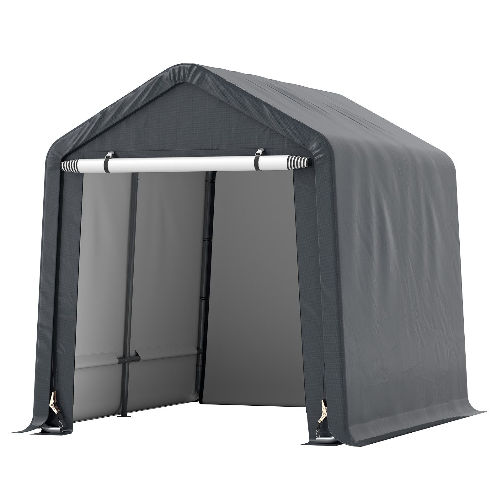 Dieses vielseitige Aufbewahrungszelt kann als Fahrradschuppen, Brennholzlager oder Werkzeugschuppen für unterschiedliche Bedürfnisse verwendet werden. Das Outdoor-Lagerregal hat einen Tragrahmen aus rostfreiem, stabilem, verzinktem Metallrohr und einen Deckel aus wind- und wasserdichtem Polyethylen-Gewebe für eine dauerhaft sichere Nutzung. Darüber hinaus sorgen 4 Erdspieße und Metallplatten für einen sicheren Stand des großen Geräteschuppens und der verlängerte Deckel sorgt mit Gegengewichten für zusätzliche Stabilität. Der Schuppen verfügt über eine Rolltür, die den Zugang und die Luftzirkulation erleichtert. Der Schuppen ist mit federbelasteten Schnallen und elastischen Bändern für eine einfache Montage ausgestattet. Der Deckel lässt sich außerdem mit einem Ratschensystem sicher schließen.