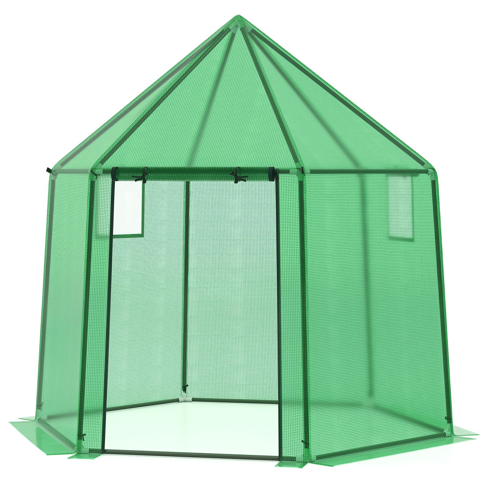 Unser Mini-Walk-in-Gewächshaus misst 198 x 172 x 190 cm (L x B x H) und verfügt über eine aufrollbare Reißverschlusstür für einfachen Zugang und doppellagige Mesh-Fenster für Belüftung, wodurch eine ideale Wachstumsumgebung geschaffen wird, die sowohl zugänglich als auch atmungsaktiv ist. Die Schutzabdeckung besteht aus zuverlässigem PE-Material, das besseren Sonnenschutz und Wärmespeicherung bietet, während kleine Tiere davon abgehalten werden, Ihre schönen Pflanzen zu beißen. Der Rahmen besteht aus soliden Metallrohren mit PE-Beschichtung, die hohen Temperaturen standhalten und Schutz vor Rost und Wasser bieten. Um die Windbeständigkeit zu verbessern, liefern wir überlange Abdeckungen, Metallheringe und Windseile zur Befestigung.