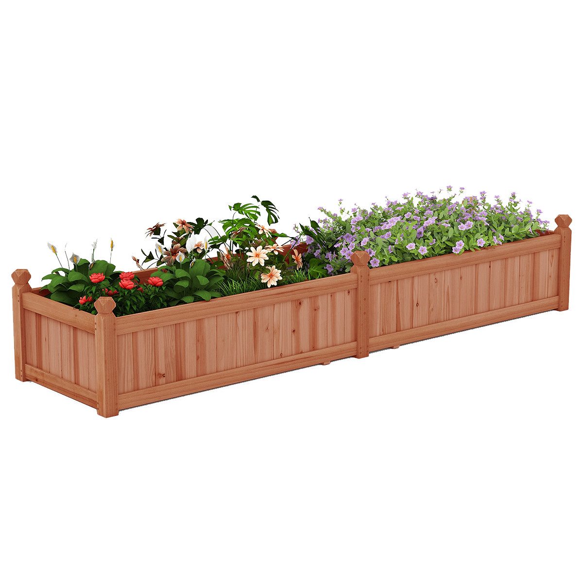 Gefertigt aus natürlicher Tannenholzkonstruktion ist der rechteckige Pflanzenkasten rissbeständig und gewährleistet eine langanhaltende Haltbarkeit. Der Gartenpflanzer ist mit einem Schutzlack überzogen, um die Wartung zu erleichtern. Mit einem großzügigen Fassungsvermögen von 0,35 m³ bietet der Gartenpflanzer reichlich Platz für Ihre gedeihenden Pflanzen und Blüten. Das Hochbeet umfasst 2 Trennwände, die es ermöglichen, verschiedene Pflanzen zu ziehen, ohne deren harmonisches Wachstum zu stören. Die Entwässerung wird durch Entwässerungslöcher und Lücken vereinfacht, wodurch überschüssiges Wasser entfernt und essentielle Bodennährstoffe bewahrt werden.