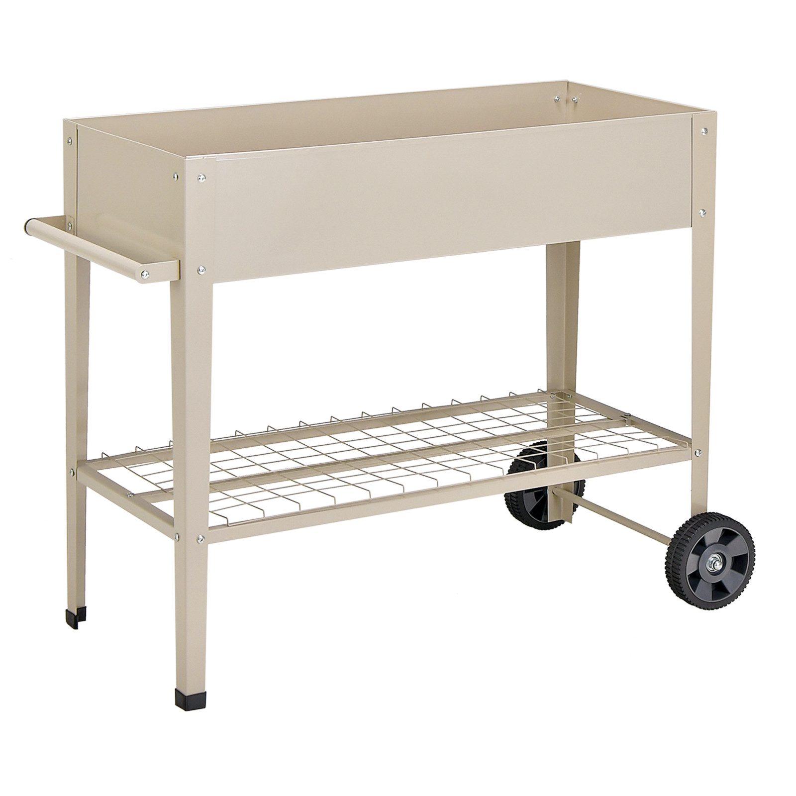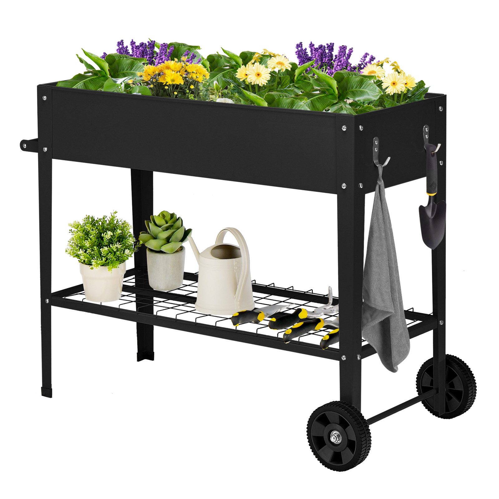 Warum sollten Sie sich für unser Hochbeet entscheiden? Unser Hochbeet ist mit einem großen Pflanzkasten und einem Metallregal ausgestattet und bietet viel Wachstums- und Stauraum für Ihre Lieblingsblumen, Kräuter, Gemüse und Gartengeräte. Und es gibt 2 Aufhängehaken, damit Sie Ihre Werkzeuge immer griffbereit haben. Darüber hinaus erleichtern integrierte Abflusslöcher den Wasserabfluss und schaffen so eine ideale Umgebung für das Pflanzenwachstum. Dank der erhöhten Beine ermöglicht Ihnen das Pflanzbeet außerdem das Düngen und Gießen, ohne dass Sie sich hinhocken müssen. Im Gegensatz zu den meisten Hochbeeten, die sich nicht leicht bewegen lassen, verfügt unseres über zwei Räder und einen Seitengriff für müheloses Bewegen. Unser Hochbeet besteht aus einem Metallrahmen mit Finish, ist stabil und verformt sich nicht leicht.