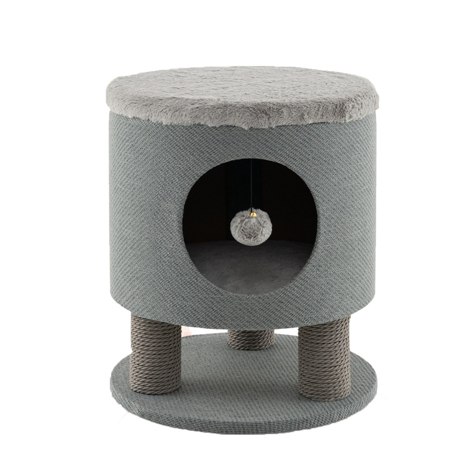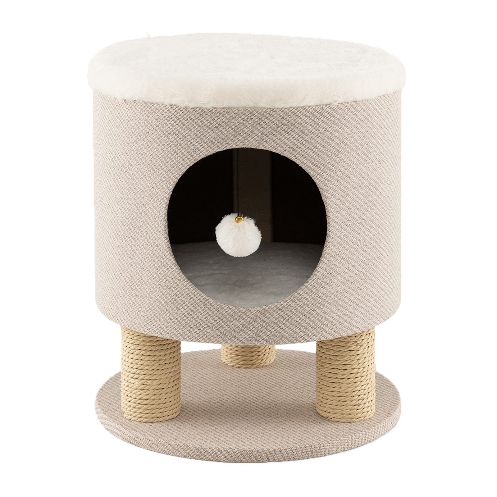 Der Hocker mit inkludierter Katzenhöhle ist ein vielseitiges und innovatives Katzenmöbelstück, das nicht nur Ihren Katzenfreunden einen gemütlichen Platz zum Ausruhen und Spielen bietet. Es ist auch ein bequemer Ottoman oder Hocker für den Besitzer. Der Hocker verfügt über drei stabile Pfosten, die mit einem Kraftpapierseil umwickelt sind, das dazu beiträgt, die Krallen Ihrer Katze in einem gesunden Zustand zu halten und gleichzeitig die Möbel vor Kratzern zu schützen. Darüber hinaus ist ein hängender Ball im Lieferumfang enthalten, um den Katzen Spaß zu bereiten. Das Katzenhaus ist mit Kunstleinenstoff bezogen, der für hervorragende Strapazierfähigkeit und ein schickes Aussehen sorgt.