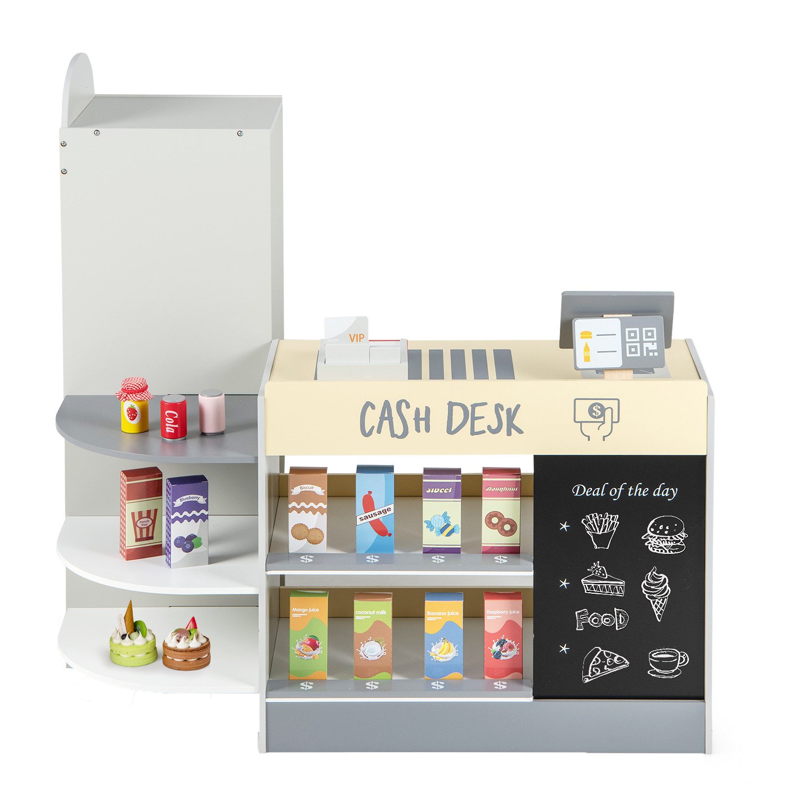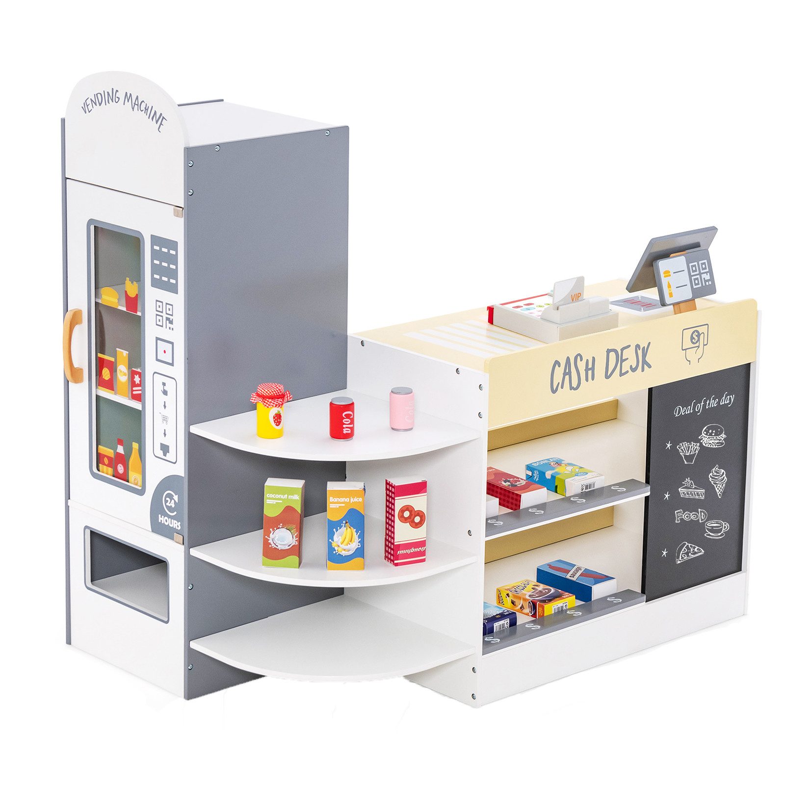 Der seitliche Verkaufsautomat ermöglicht es Kindern, vorzugeben, Snacks und Getränke zu platzieren, verschiedene Artikel zu kaufen oder den Artikel herauszunehmen. Kleinkinder dürfen auch Preise auf die Tafel schreiben. Oder sie können auch das Auschecken oder Einkaufen mit einer Holz-POS-Maschine und einer Kreditkarte simulieren, um mehr über Geld zu lernen. Außerdem gibt es 3 offene Regale und 2 Ausstellungsgestelle, um verschiedene Dinge zu lagern und Kindern zu helfen, sich eine gute Gewohnheit des Ordens zu entwickeln.