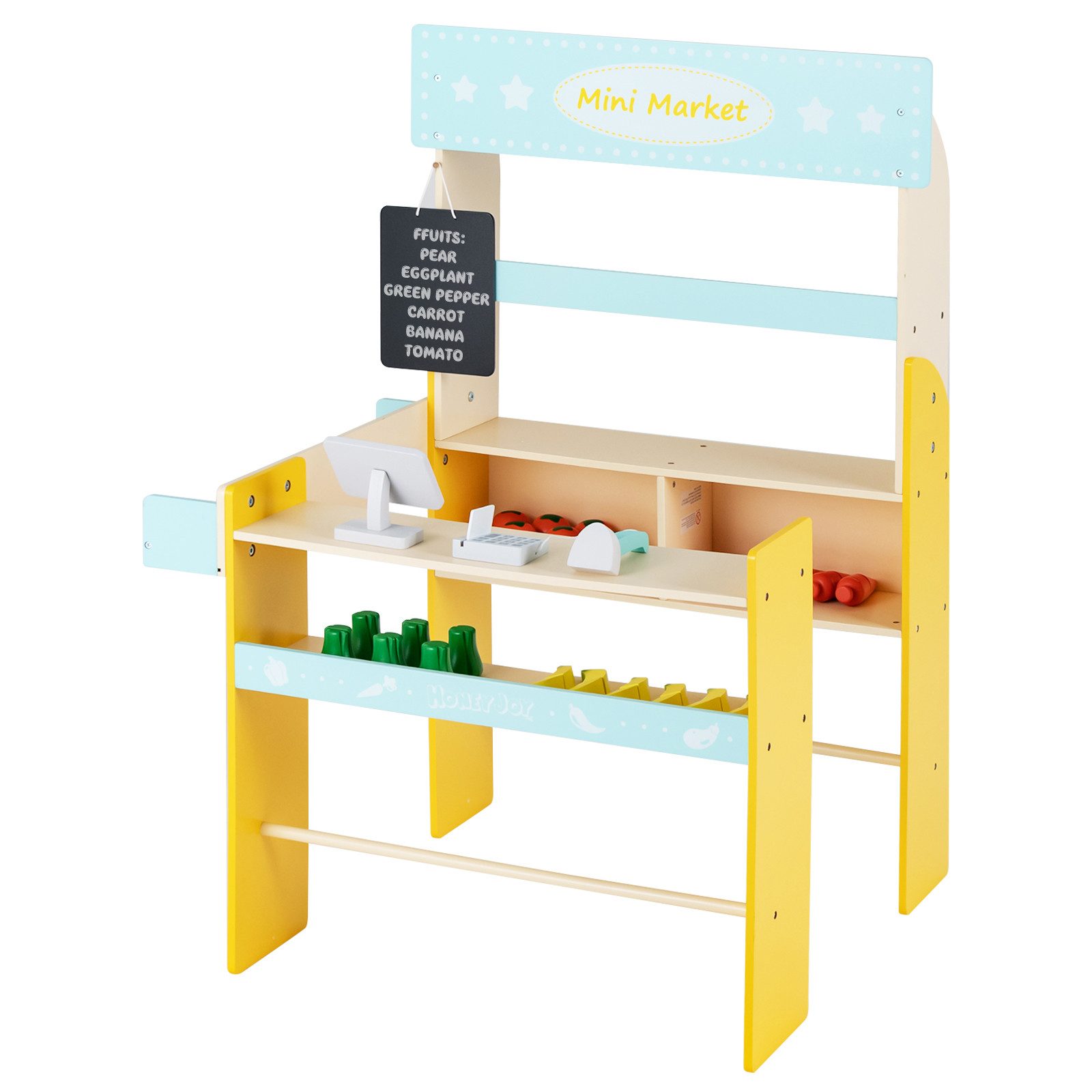 Lieferumfang | 1 x Spielzeug-Einkaufsladen 6 x Tomate 6 x Banane 6 x Karotte 6 x Grüne Paprika 6 x Aubergine 6 x Birne 1 x POS-Maschine 1 x Scanner 1 x Kasse 1 x Anleitung |