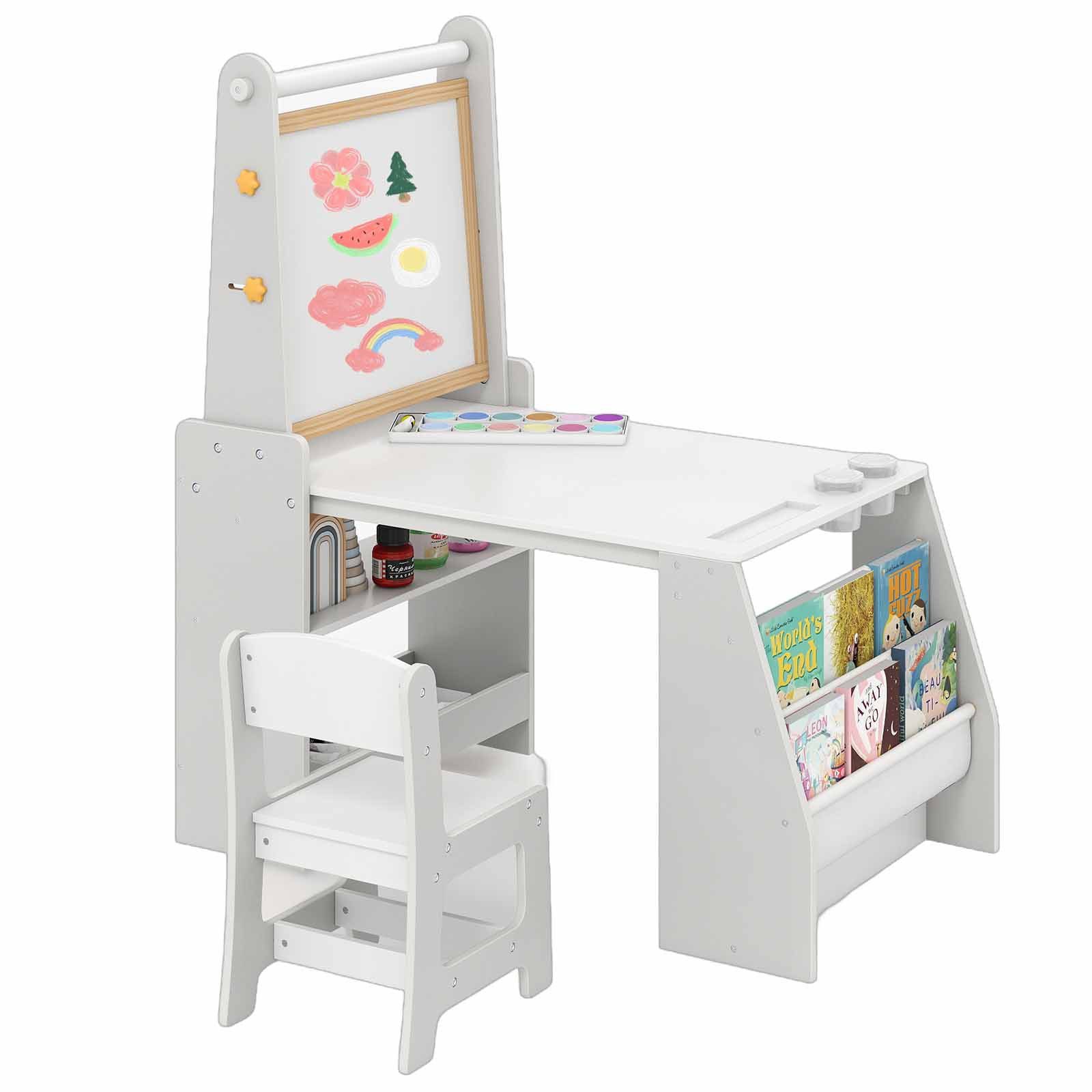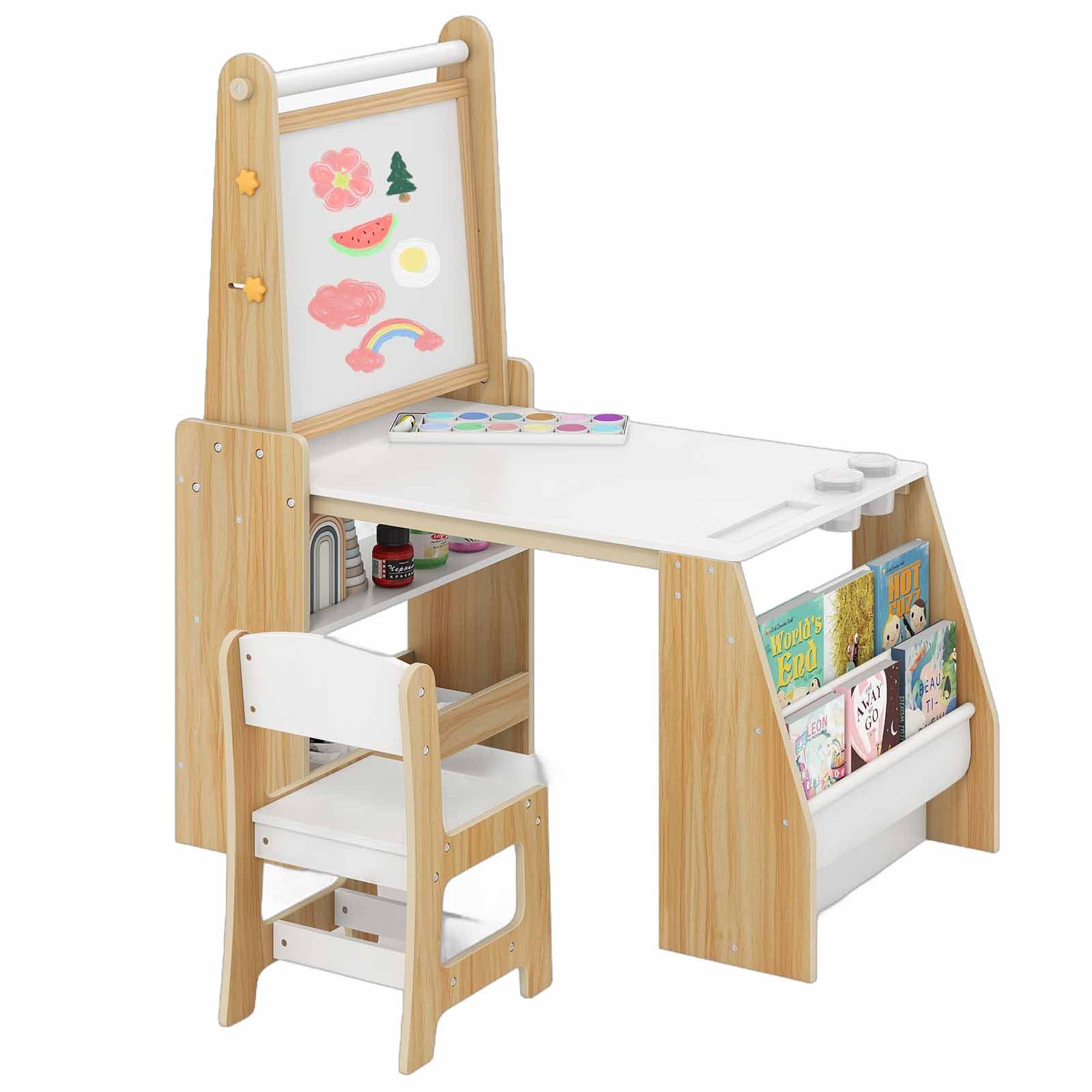 Bauen Sie ein Aktivitätszentrum für Kinder mit unserem Kunsttisch- und Stuhl-Set! Es gibt einen Tisch, einen Stuhl und eine Staffelei für Kinder, um verschiedene Aktivitäten auszuprobieren. Die doppelseitige Kinderstaffelei verfügt über ein magnetisches Whiteboard, eine Kreidetafel und eine austauschbare Papierrolle für ausreichend Zeichenfläche. Der ergonomische Stuhl sorgt für ein bequemes Sitzerlebnis. Zusätzlich bieten 1 breiter Tisch, ein 2-stufiges Bücherregal und 2 offene Regale reichlich Stauraum, um das Zimmer ordentlich zu halten.