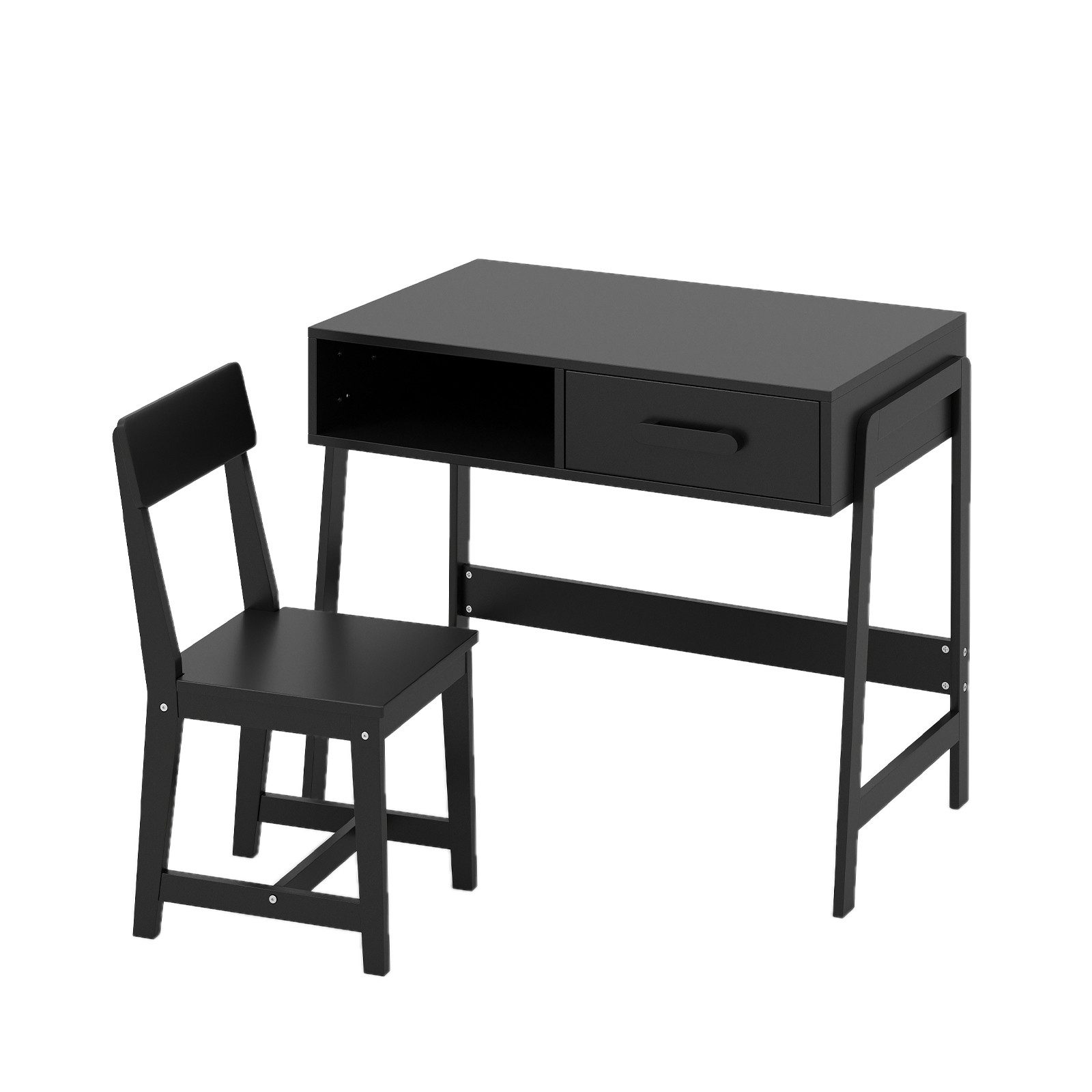 Der geräumige Schreibtisch, das Regal und die große Schublade bieten reichlich Platz für Aktivitäten. Der Hochlehner-Stuhl unterstützt die Haltung. Es ist mit massiven Kiefernholzbeinen und einer verstärkten Querstange gebaut, ermöglicht eine Belastbarkeit von 75 kg für den Tisch und 55 kg für den Stuhl.