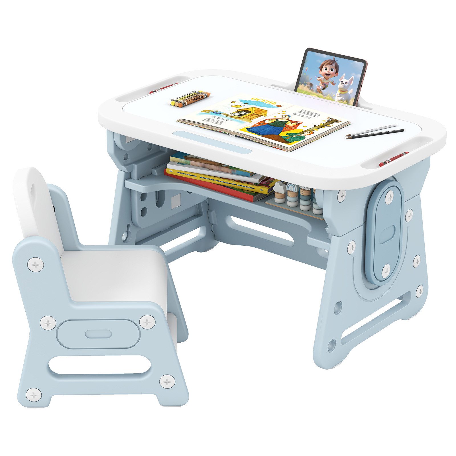 Das vielseitige Tisch- und Stuhl-Set für Kinder ist eine ideale Wahl für Kinder zum Lesen, Schreiben und Zeichnen. Das neigbare Whiteboard ermöglicht es Kindern, bequem zu zeichnen. Das Whiteboard ist bemalbar und abwischbar. Kinder können die Tischhöhe auch nach ihren unterschiedlichen Bedürfnissen ändern. Das konkave Regal und die Stifttaschen bieten reichlich Stauraum. Die ergonomische Rückenlehne und der glatte Sitz sorgen für ultimativen Sitzkomfort. Die abgerundeten Ecken des Tisches und des Stuhls sorgen für einen sicheren Spiel- oder Lernbereich.