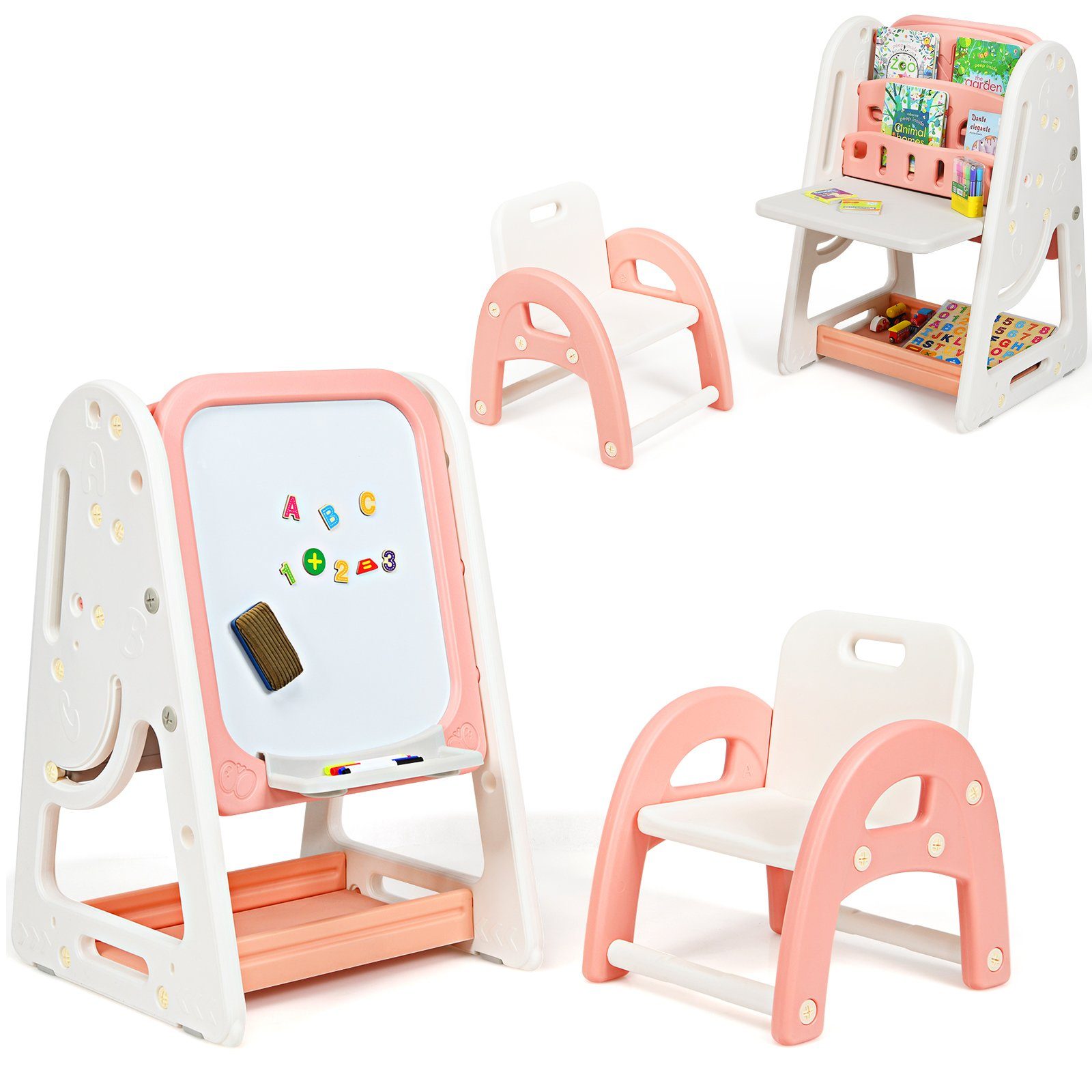 Dieses erstklassige Lernspielzeug kombiniert eine magnetische Trockenlöschtafel und das Kinderbuchregal mit einer geräumigen Arbeitsfläche. Mit ihm können Ihre Kinder schöne Bilder auf die Tafel malen und auf der anderen Seite Hausaufgaben machen oder Bücher lesen. Die Arbeitsfläche lässt sich zur einfachen Aufbewahrung zusammenklappen. Außerdem bietet die ergonomische Form ein bequemes Sitzerlebnis. Diese Kinderkunststaffelei kann in 3 Positionen verstellt werden, womit sie für Kinder unterschiedlicher Размер geeignet ist. Zusätzlich bieten das große Tablett und die untere Ablagefläche genügend Stauraum. Diese aus hochwertigem HDPE hergestellte Kunststaffelei ist sicher. Mit dem süßen Zubehör können Ihre Kinder zeichnen, schreiben, lernen usw.