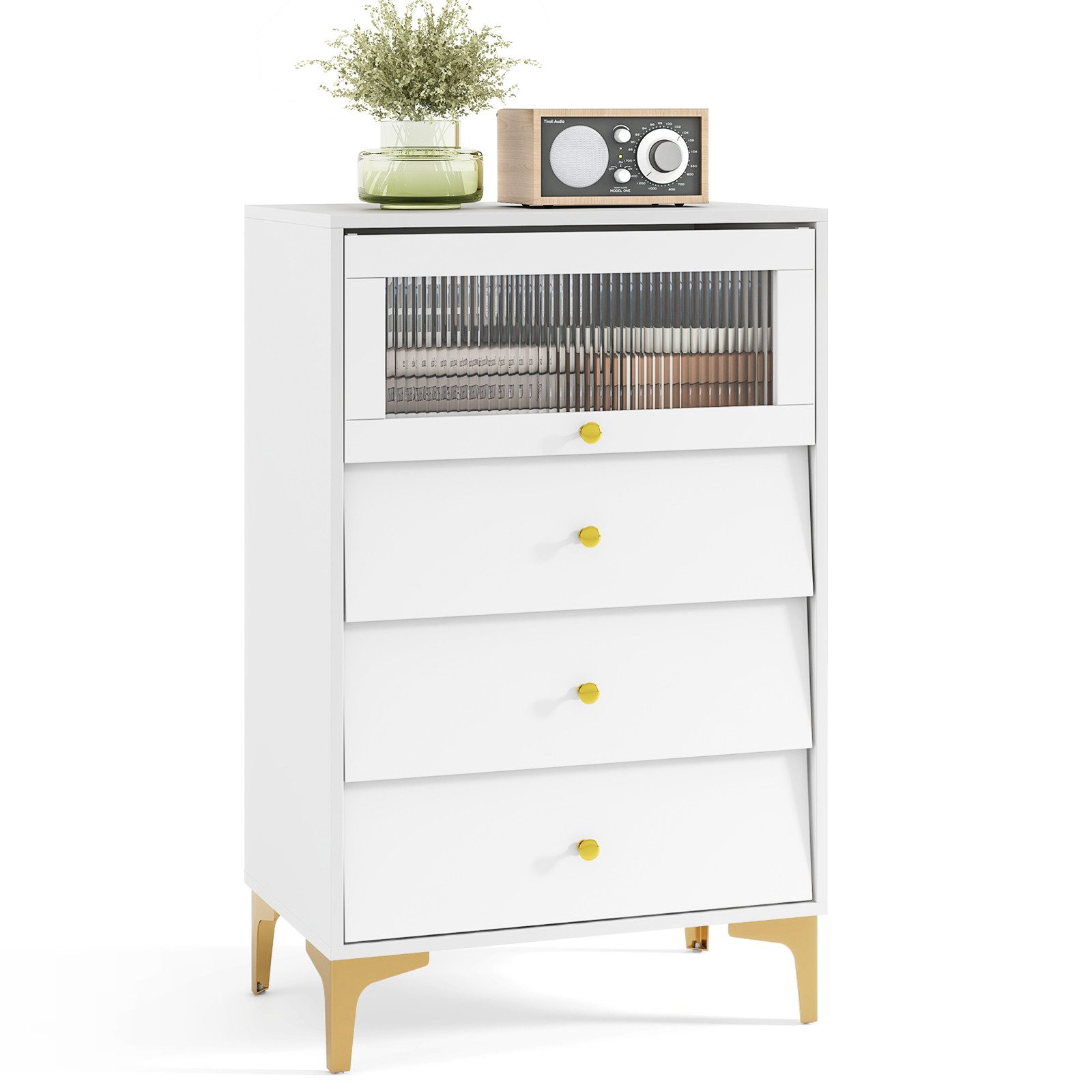 Maximieren Sie Ihren verfügbaren Platz mit unserer Aufbewahrungskommode!!! Sie ist mit 3/4 großen Schubladen und 1 kleinem Schrank ausgestattet, um Ihre Sachen aufzubewahren. Mit L-förmigen Metallbeinen und einem Kippschutzdesign steht der Schrank stabil und fest. Darüber hinaus ermöglicht die hochklappbare Glastür einen einfachen Zugriff. Die praktischen Griffe und Metallschienen helfen Ihnen, die Schubladen einfach zu öffnen, um auf Ihre Sachen zuzugreifen. Die geriffelte Glastür und die geneigten Schubladentüren verleihen Ihrem Zimmer eine elegante Note. Sie können sie in Schlafzimmern, Fluren oder Eingängen aufstellen. Zu Ihrem Vorteil ist sie leicht zusammenzubauen und zu reinigen.