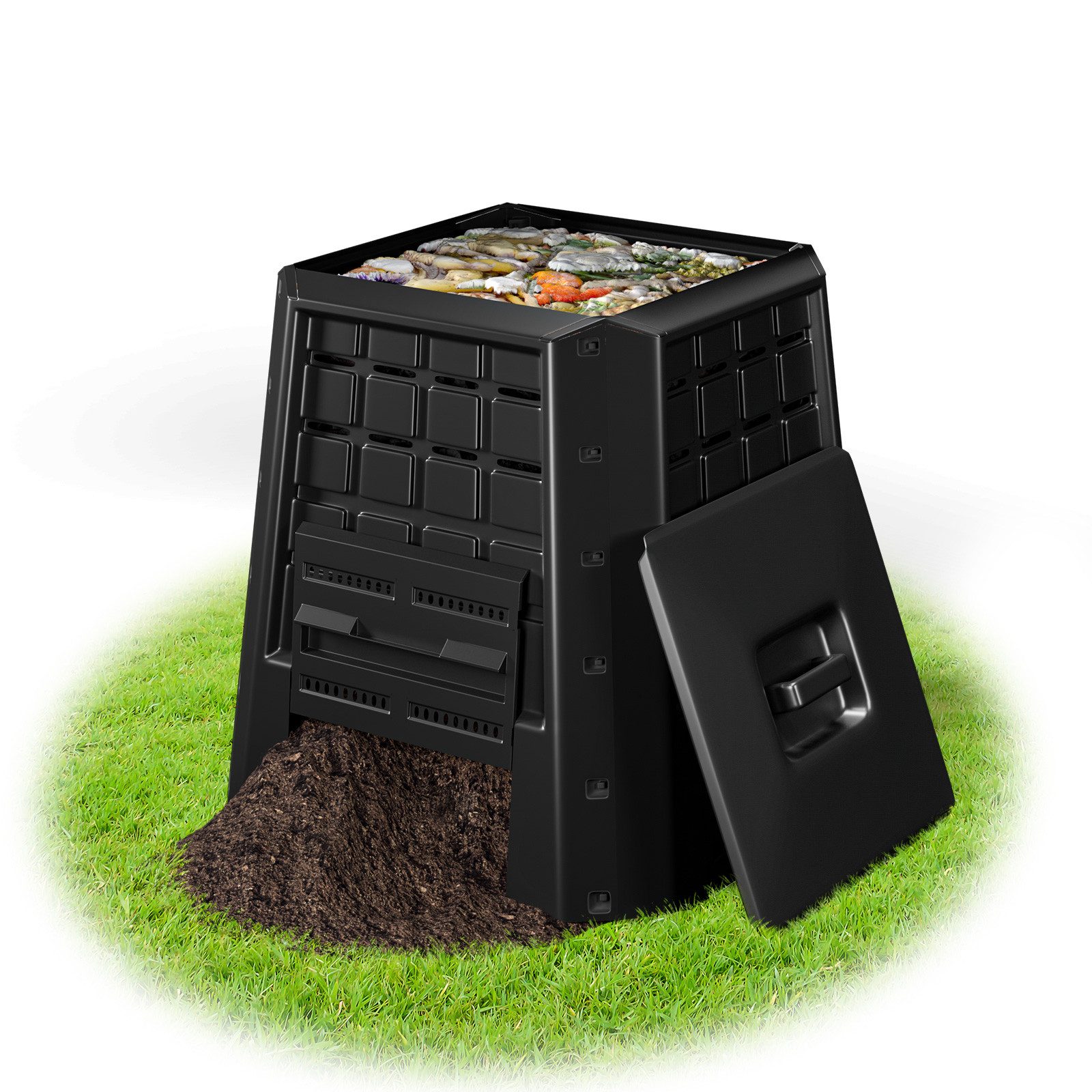 Unser Kompostbehälter besteht aus hochwertigem PP für Langlebigkeit. Das Fassungsvermögen des Behälters beträgt 380 L, was eine große Menge Abfall aufnehmen kann. Unser Kompostbehälter hat einen Deckel und Schiebetüren, um Küchenabfälle zu laden und den Kompost freizugeben. Darüber hinaus gibt es mehrere Luftschlitze an vier Seiten des Kompostierbehälters, die den Kontaktbereich zwischen Fermentation und Sauerstoff vergrößern und die Kompostierungseffizienz verbessern.