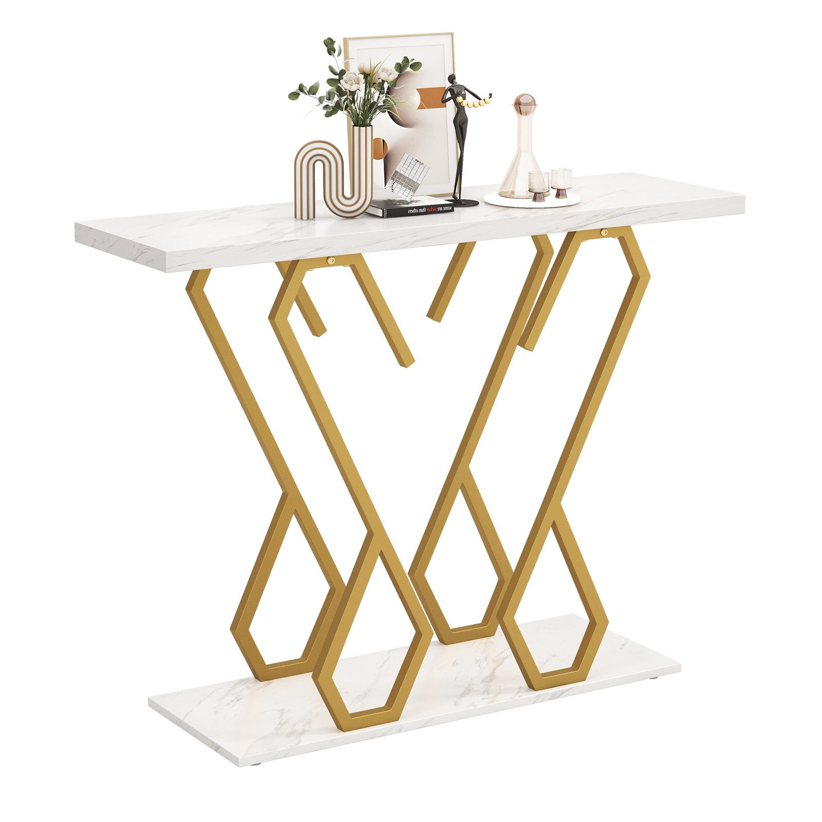 Mit seiner Tischplatte aus Kunstmarmor, die einen Hauch von Eleganz verleiht, ist der Konsolentisch in dieser Beschreibung sowohl stilvoll als auch praktisch. Mit den Maßen 100 x 30 cm (L x B) bietet die Tischplatte ausreichend Platz zum Abstellen von Snacks, Zeitschriften oder Dekoartikeln. Die verstärkte Metallbasis sorgt für Stabilität und Robustheit mit einer bemerkenswerten Tragfähigkeit von bis zu 75 kg. Sein besprühter Rahmen ist wirksam gegen Rost und gewährleistet eine dauerhafte Nutzung. Eine vergrößerte Basis und Kippsicherungen sorgen für zusätzliche Stabilität und Sicherheit, sodass er für jede Familie geeignet ist. Mithilfe der mitgelieferten Anleitung lässt er sich leicht zusammenbauen und die glatte Oberfläche macht die Reinigung zum Kinderspiel. Zögern Sie nicht länger, bestellen sie noch heute!
