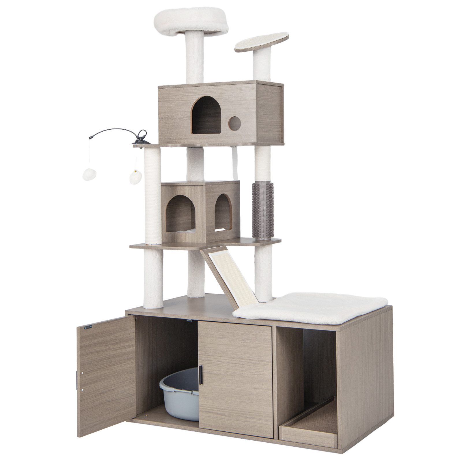 Mit einer großen versteckten Katzentoilette, einem Kratzbrett und einem Wickeleingang sorgt unser Kratzbaum dafür, dass Ihr Zuhause sauber und geruchsfrei bleibt. Als vielseitiger Kratzbaum verfügt er über eine großzügige Sitzfläche aus Plüsch und zwei bequeme Liegeplätze, die mehreren Katzen ausreichend Platz zum Ausruhen und Entspannen bieten. Zusätzlich enthält der Baum 2 baumelnde Bälle, um Ihre Katzen zu unterhalten. Darüber hinaus hilft der mitgelieferte Selbstpfleger Katzen dabei, lose Haare zu entfernen und so für einen gesünderen Körper zu sorgen. Und dank den mit Sisal umwickelten Kratzpfosten können Sie sich von zerkratzten Möbeln verabschieden. Er ist mit einer Kippsicherung und 5 verstellbaren Fußpolstern ausgestattet, um auch auf unebenem Untergrund eine perfekte Balance zu gewährleisten. Außerdem sind die abnehmbaren Kissen bequem und leicht zu reinigen. Somit ist es das perfekte Geschenk für Ihre Katzen!