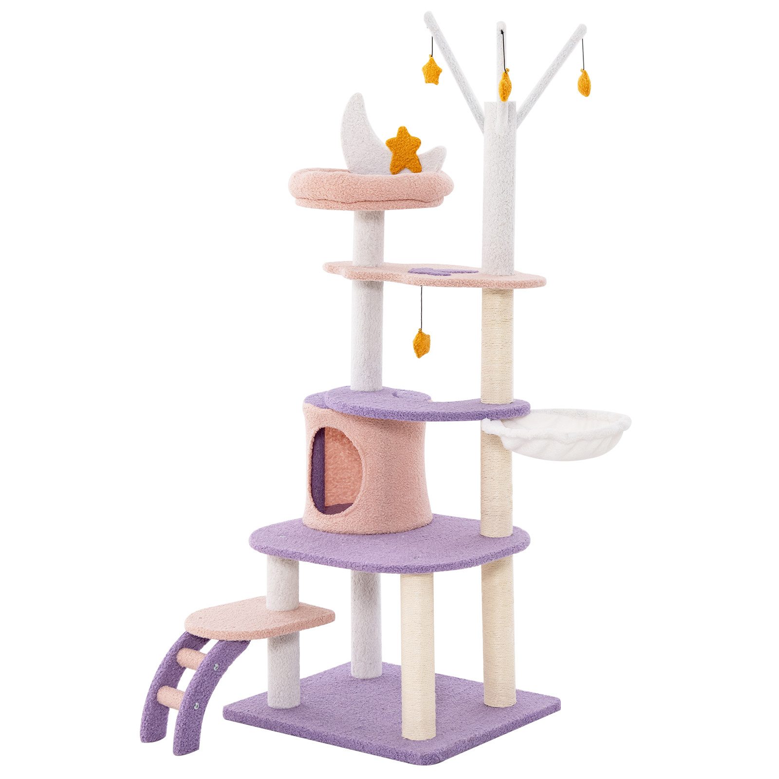Unser großer Kratzbaum ist mit einer Plattform, einer Hängematte und einer Liegefläche ausgestattet und bietet Ihrer Katze eine Vielzahl von Möglichkeiten für einen erholsamen Schlaf. Die mit Teddyfell überzogene Oberfläche sorgt für einen gemütlichen Touch. Der Kratzbaum ist mit einem 7,2 cm hohen Kratzbaum ausgestattet, um das instinktive Kratzbedürfnis Ihrer Katze zu befriedigen. Darüber hinaus ist der Kratzbaum mit einer Leiter ausgestattet, die älteren Katzen einen sicheren Zugang zur oberen Ebene ermöglicht. Der breite Sockel und die abgerundeten Ecken sind so konzipiert, dass Sie sich keine Sorgen über versehentliche Verletzungen machen müssen. Das lilafarbene Katzenstreu hat außerdem den Mond und die Sterne als verträumte Elemente, die in jeder Ecke gut zur Geltung kommen.