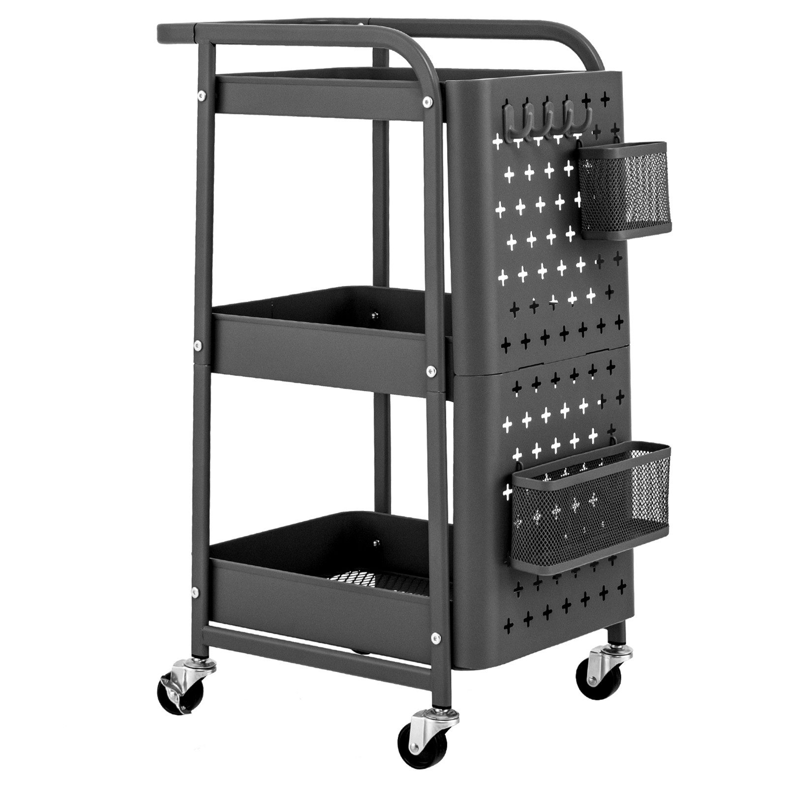 Unser 3-stöckiger Rollwagen befreit Ihr Zuhause vom Chaos! Der Mehrzweckwagen mit platzsparendem und abgestuftem Design nimmt nicht zu viel Bodenfläche ein und bringt gleichzeitig viel Stauraum in Ihr Zuhause und Büro. Die 3 Gitterregale können verschiedene Kleinigkeiten aufnehmen. Außerdem sind die abnehmbaren Stecktafeln mit 2 Körben und 4 Haken ausgestattet und bieten Ihnen einen Heimwerkerbereich für eine personalisierte Organisation. Der pulverbeschichtete Karbonstahl sorgt für große Stabilität und Langlebigkeit. Mit 4 Universalrollen können Sie den Wagen problemlos von Raum zu Raum bewegen. Darüber hinaus können 2 der Räder festgestellt werden, um plötzliche Bewegungen zu vermeiden.