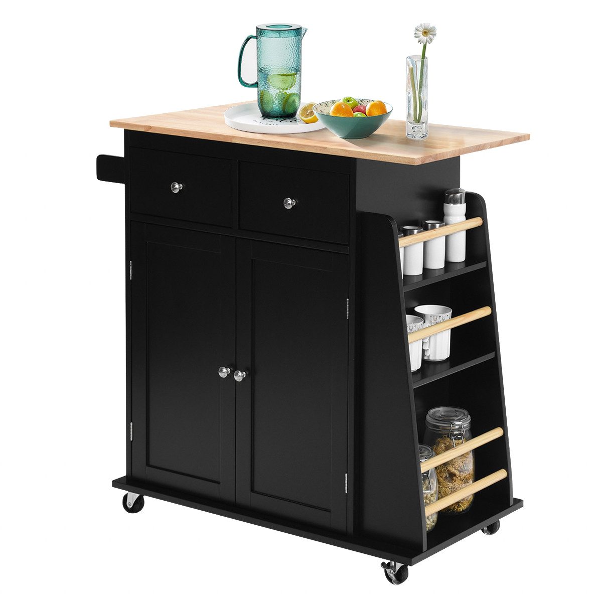 Ausgestattet mit einer breiten Massivholz-Arbeitsplatte, einem 2-türigen Schrank, 2 Schubladen, einem Handtuchhalter und einem 3-stöckigen Gewürzregal bietet diese Kücheninsel auf Rollen ausreichend Stauraum für Ihre Küchenutensilien und kann diese gut organisiert aufbewahren. Das Regal im Inneren des Schranks kann auf 3 verschiedene Positionen eingestellt werden, um unterschiedlichen Aufbewahrungsanforderungen gerecht zu werden. Der seitliche Handtuchhalter kann auch als praktischer Schiebegriff verwendet werden. Aus massivem Gummibaumholz und strapazierfähigem MDF gefertigt, sorgt dieser Servierwagen für hervorragende Stabilität, Belastbarkeit und eine lange Lebensdauer.