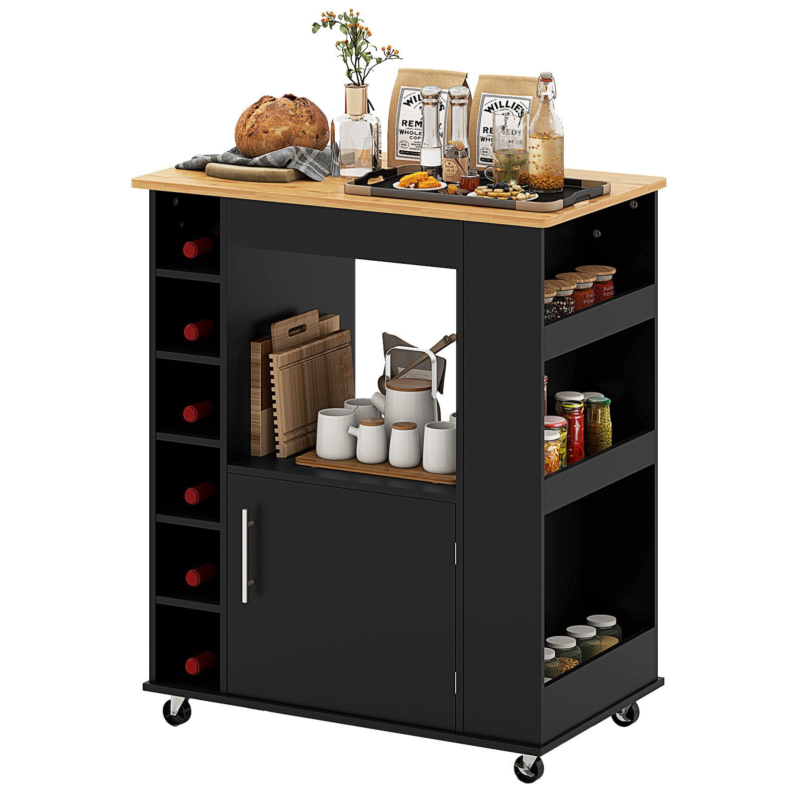 Verbessern Sie Ihr Koch- und Unterhaltungserlebnis mit diesem unverzichtbaren Küchenwagen mit verschiedenen Aufbewahrungslösungen, die alle Ihre Bedürfnisse erfüllen. Dieser Wagen ist mit einer breiten Arbeitsplatte, einem praktischen offenen Regal, einem Weinregal für 6 Flaschen, einem seitlichen Gewürzregal, einem Schrank und einem Handtuchhalter ausgestattet und bietet ausreichend Stauraum für Wein, Waschlappen, Geschirr, Lebensmittel, Schüsseln und Teller. Darüber hinaus ist dieser Küchenwagen aus Bambus und MDF-Platten gefertigt und für den täglichen Gebrauch ausgelegt. Außerdem erleichtert dieser Wagen die Flexibilität und Mobilität in Ihrer Küche und ist mit 360°-Universalrädern sowie zwei feststellbaren Rädern ausgestattet, sodass Sie den Wagen bei Bedarf sicher an seinem Platz befestigen können. Verleihen Sie Ihrer Küche Funktionalität und Stil mit unserem vielseitigen und benutzerfreundlichen Küchenwagen!