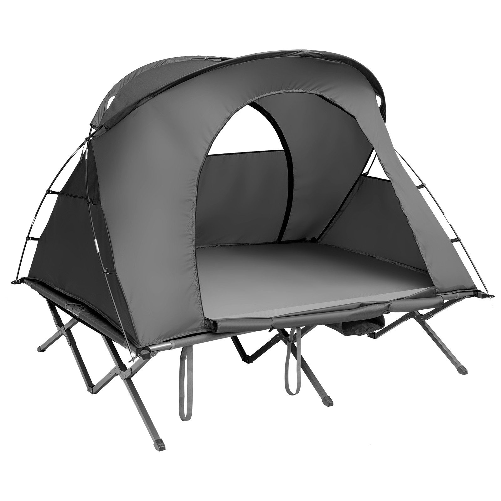 Wenn Sie noch nach einem Zelt suchen, ist unser Campingzelt die perfekte Wahl! Dieses funktionale Set umfasst ein Feldbett, wodurch Sie nicht direkt auf dem Boden schlafen müssen. Auch Kissen und eine Matratze werden mitgeliefert. Sie müssen nur den Gashahn öffnen und schon bläst sich die Matratze selbstständig auf. Innen besteht unser Zelt aus atmungsaktivem Stoff und außen ist es wasserdicht. Sie können die äußere Abdeckung bei Bedarf auch abnehmen. Die Fenster bestehen aus Oxfordstoff und Netzstoff, wodurch eine gute Luftzirkulation garantiert ist. Der große Eingang ermöglicht einen einfachen Zugang. Das Zelt ist groß genug für 2 Erwachsene. Es gibt zwei praktische Taschen für das Handy und Schuhe. Wenn Sie Licht brauchen, können Sie eine Lampe an den Haken hängen.Durch die kreuzförmige Metallstruktur liegt die maximale Tragkraft bei ca. 300 kg. Das Zelt ist leicht und mit der Tasche auf Rollen mühelos zu transportieren.