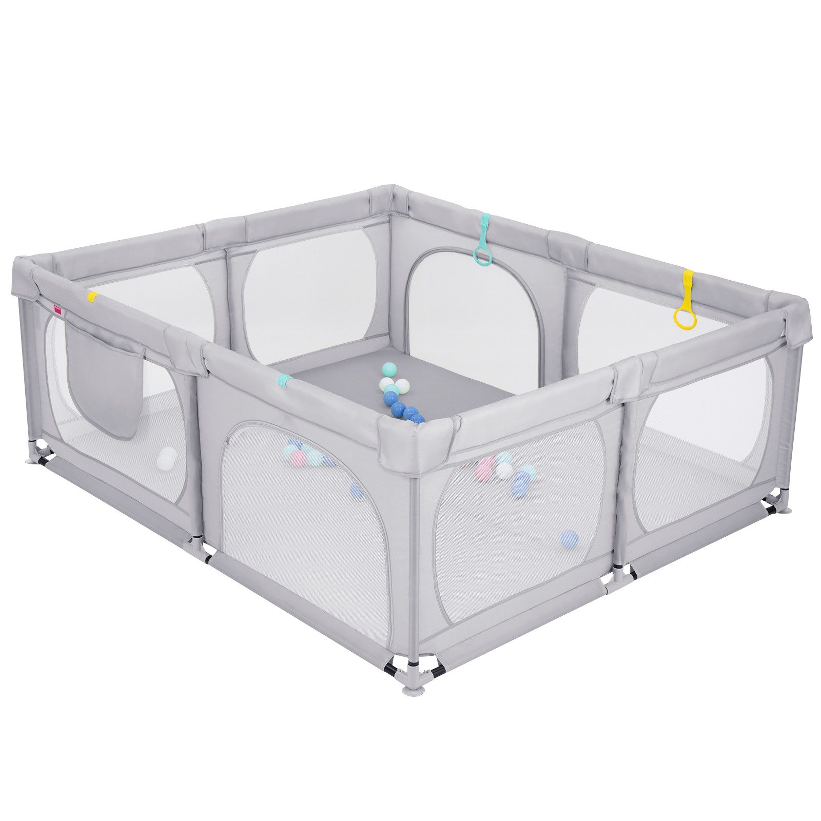 Dies großzügige Aktivitätszentrum bietet Platz für 3-5 Kinder. Es wird ein schöner Ort für Ihre Kleinen sein, um frei zu spielen und zu erkunden. Darüber hinaus verfügt es über 4 Zugringe zum Üben des Stehens und 50 Ozeanbälle zum lustigen Spielen. Es gibt eine Aufbewahrungstasche für verschiedene Gegenstände. Es ist auch mit Reißverschlusstüren, Eckenschutz und durchsichtigen Netz Wänden ausgestattet, um eine herausragende Sicherheit zu gewährleisten. Darüber hinaus ist dieses Spielgehege aus hochwertigem Oxford-Gewebe und Metallrohren für eine lange Lebensdauer gefertigt. Nach Gebrauch erleichtert die Tragetasche das Tragen und Aufbewahren.