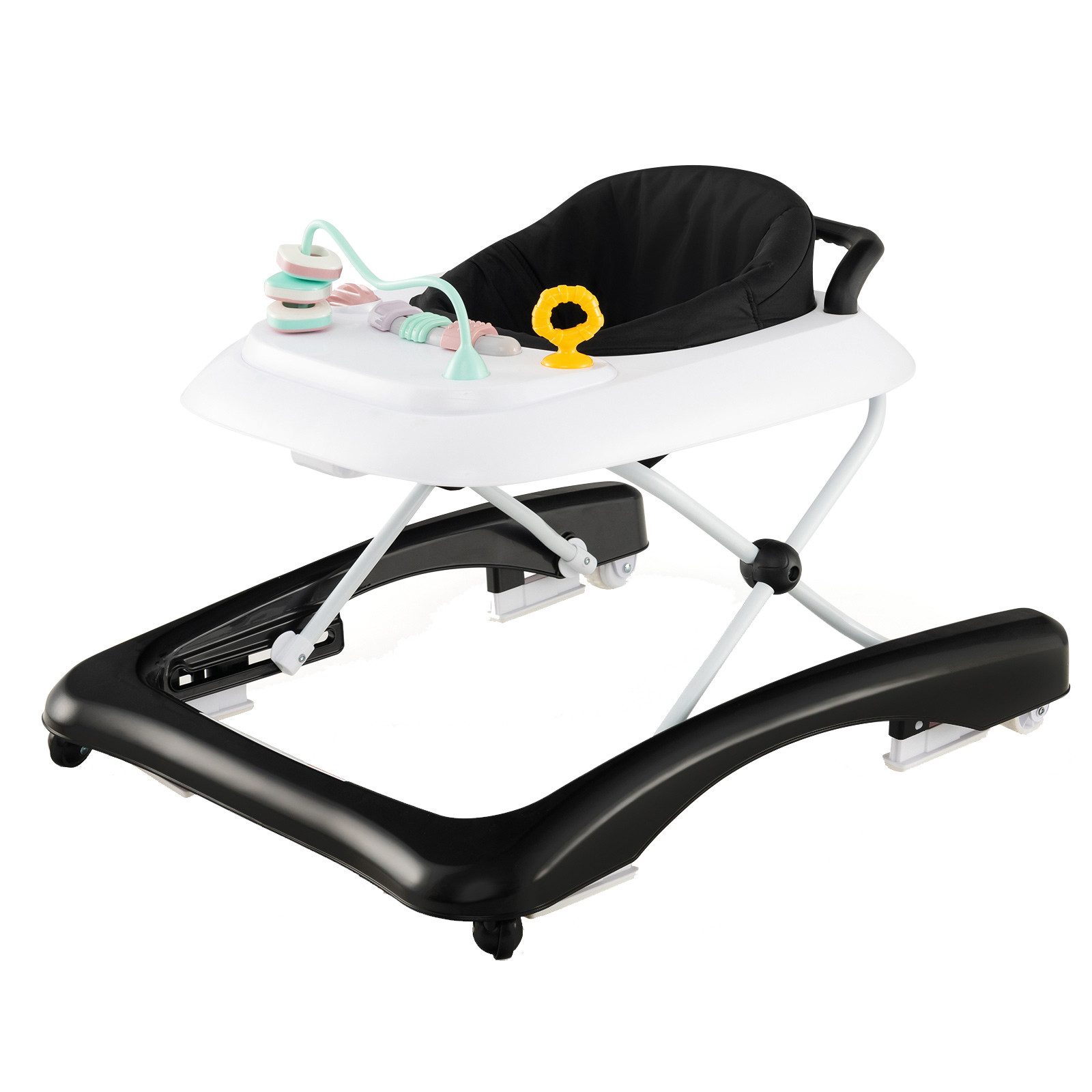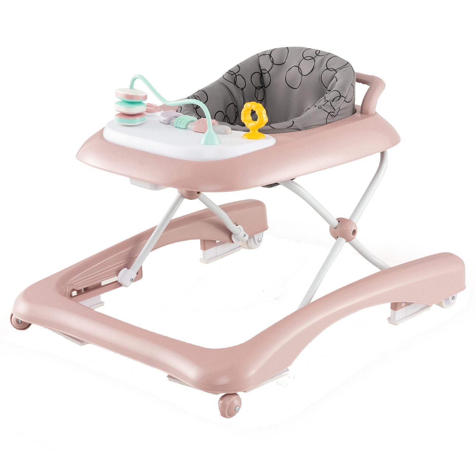 Unterstützen Sie die Entwicklungsmeilensteine Ihres Kindes mit unserem faltbaren Baby Walker! Mit 3 verstellbaren Höhenpositionen begleitet dieser Baby Walker Ihr wachsendes Kind vom Sitzen bis zum Gehen. Die interaktive Spielzeugplatte fördert die sensorische Stimulation und die Entwicklung motorischer Fähigkeiten und bietet gleichzeitig eine Plattform für Spiel- und Essenszeiten. Sicherheit hat oberste Priorität mit universellen Vorderrädern, hinteren Geschwindigkeitsreduktionsrädern und rutschfesten Fußpolstern für Stabilität. Dieser Baby Schiebewagen verfügt über ein atmungsaktives und waschbares Sitzkissen und eine ergonomische Rückenlehne zur Unterstützung der Wirbelsäule. Das einfache Falt-Design ermöglicht eine bequeme Aufbewahrung und Portabilität, was dieses Aktivitätszentrum für Kleinkinder zu einer vielseitigen und praktischen Wahl für Familien unterwegs macht.