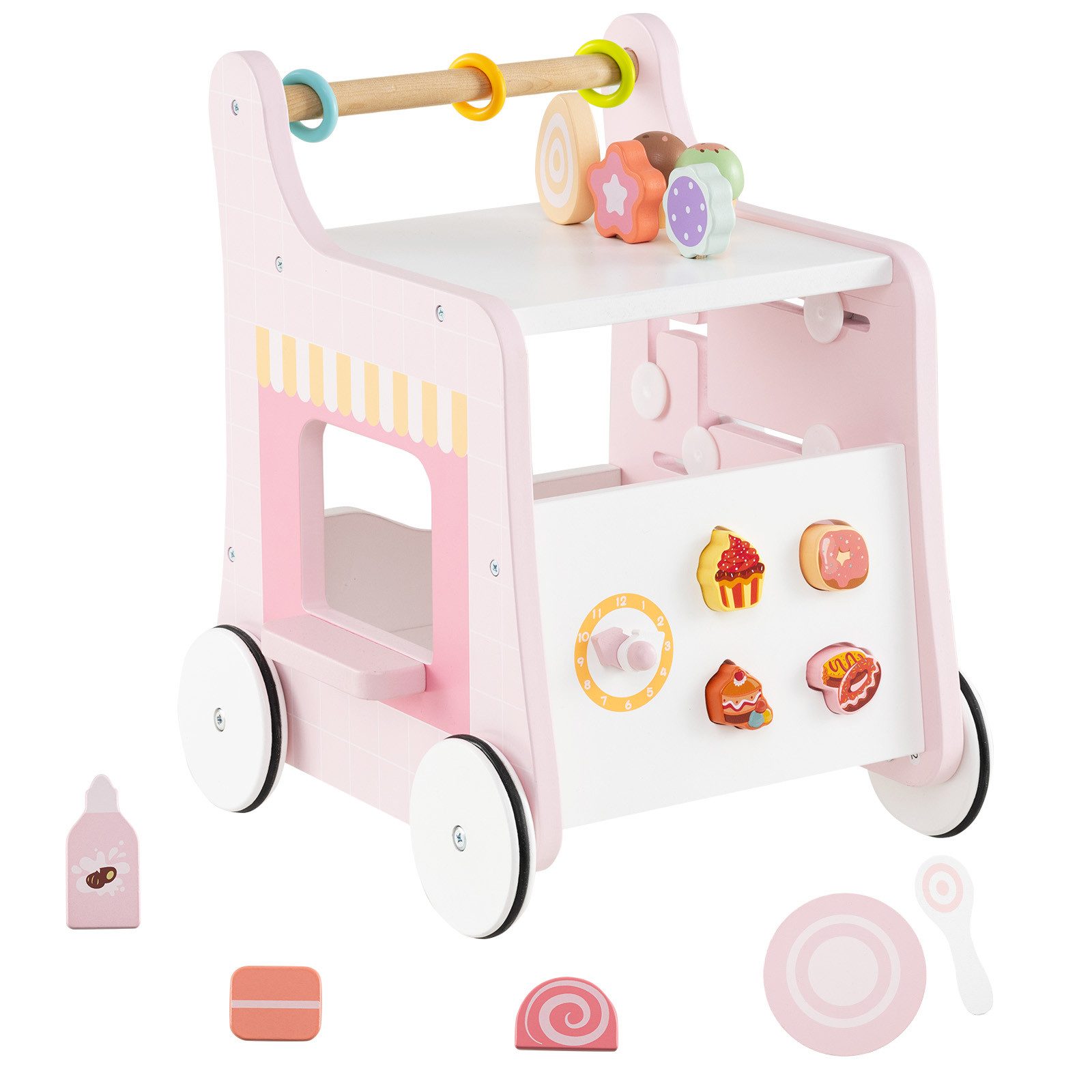 Die multifunktionale Lauflernhilfe bietet Ihrem Kleinkind jede Menge Spaß. Ein farbenfrohes Schaufenster an der Seite regt zu fantasievollen Rollenspielen an. Die Lauflernhilfe wurde mit Blick auf die Sicherheit entwickelt und verfügt über glatte, abgerundete Kanten und ist aus robustem MDF-Material gefertigt. Die großen Räder sind mit rutschfestem und geräuscharmem Gummi gepolstert. Der bequeme Holzgriff liegt gut in der Hand. Unter der Spielfläche befindet sich ein geräumiger Stauraum, ideal zum Ordnen von Spielzeug. Dieses Aktivitätszentrum ist ideal für Kinder ab 1 Jahr und fördert mit seinen kinderfreundlichen Details Kreativität, Fantasie, Motorik und Hand-Auge-Koordination. So wird es zu einem geschätzten Begleiter in den ersten Lebensjahren Ihres Kindes.