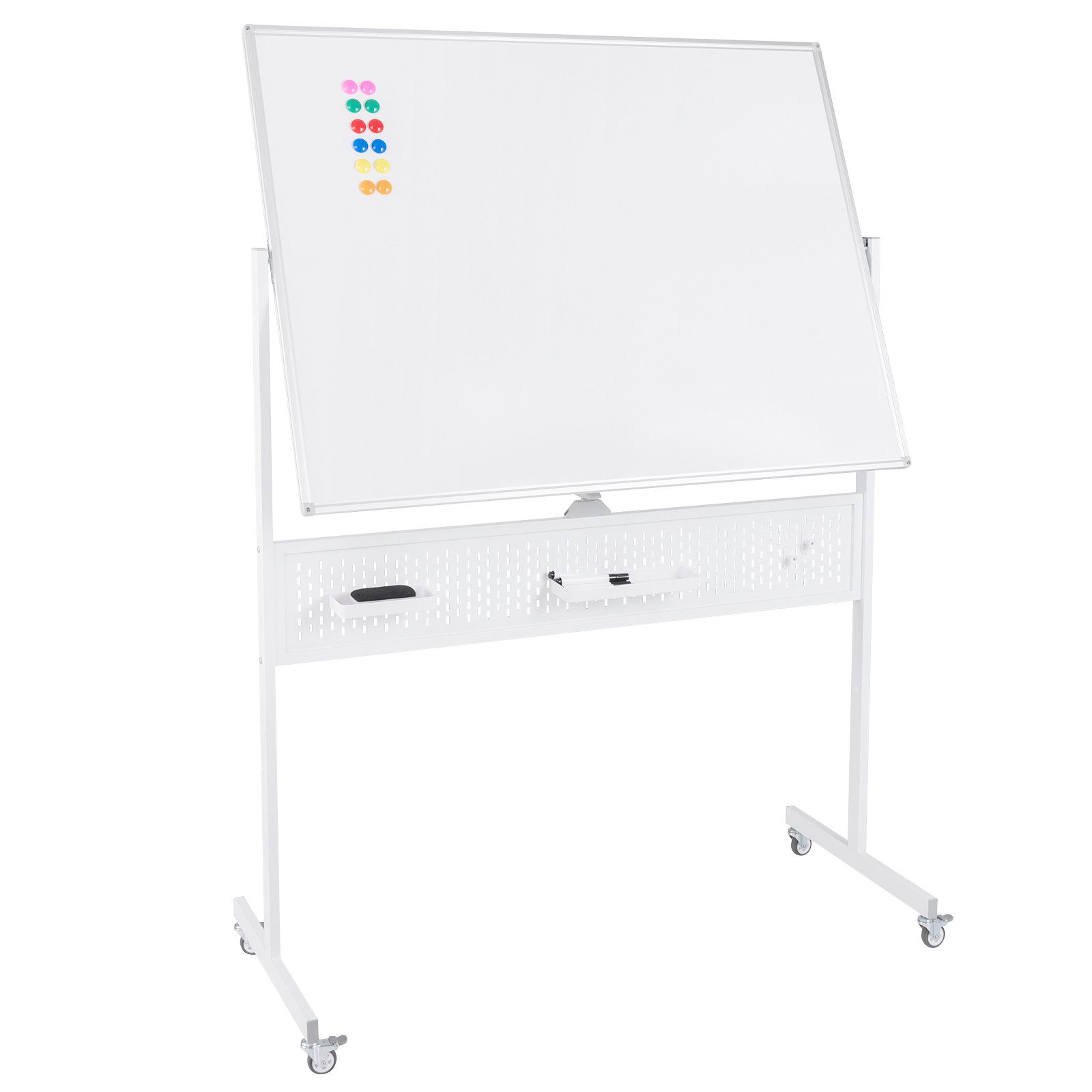 Mit den Maßen 120 x 90 cm und 2 verfügbaren Höhen (160 / 180 cm) bietet diese doppelseitige weiße Tafel reichlich Platz zum Schreiben und ist sowohl für Teenager als auch für Erwachsene geeignet. Sie ist mit den meisten trocken abwischbaren Markern kompatibel und lässt sich mühelos mit einem schnellen Wisch reinigen, ohne dass Schlieren oder Flecken zurückbleiben. Die magnetischen Oberflächen eignen sich perfekt zum Anbringen von Notizen, Diagrammen und Dokumenten für mehr Klarheit. Als zusätzlicher Bonus ist ein Zubehörset enthalten, darunter 6 Marker, ein Whiteboard-Radierer und 12 bunte Magnete. Eine integrierte Stecktafel in voller Длина sowie 2 zusätzliche Ablagefächer und 2 Haken helfen dabei, dieses Zubehör und Ihre Sachen geordnet und leicht zu finden aufzubewahren.