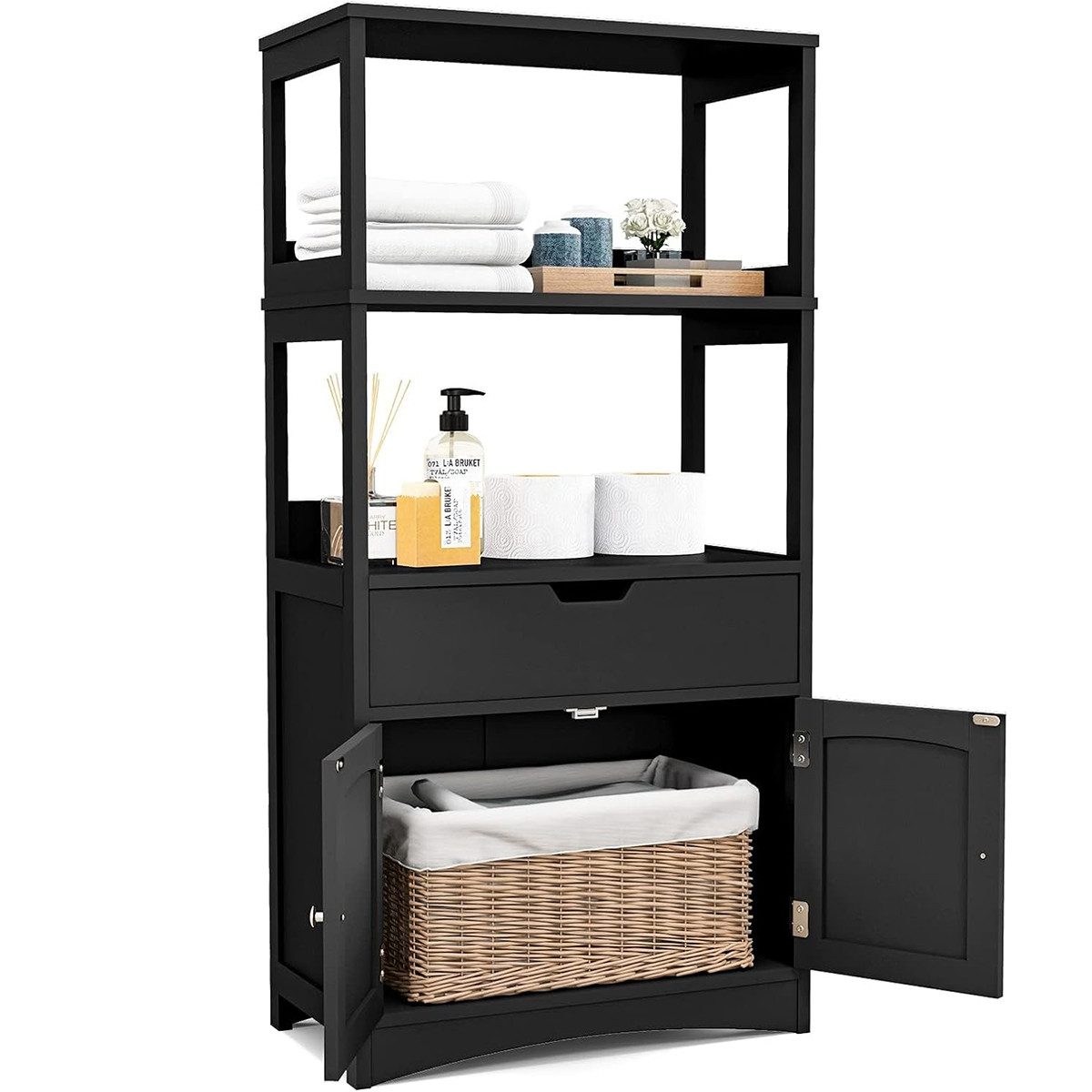 Sind Sie noch auf der Suche nach einem passenden Schrank, um wieder Ordnung in Ihrem Bad oder Küche zu schaffen? Nutzen Sie Ihren verfügbaren Platz ideal aus und schaffen Sie ein übersichtlicheres Zuhause für sich und Ihre Familie durch unseren praktischen Badezimmerschrank! Die perfekte Kombination aus umweltfreundlichen Holzplatten und der schlichten Farbe machendiesen Schrank sehr widerstandsfähig und gewährleisten eine lange Nutzungsdauer. Der stabile Rahmen sorgt hierbei für Stabilität und eine hohe Belastbarkeit. Die Kippsicherung und die in der Schublade befindlichen Stopper sorgen für zusätzliche Sicherheit. Dabei bieten Ihnen die offenen Fächer, die Ablagen im Schrank selbst und die Schublade eine Menge Stauraum und geben Ihnen die Möglichkeit, Ihre Bedarfsgegenstände optimal lagern und sortieren zu können. Die schlichte Optik und feine Verarbeitung vereinen hierbei Funktion mit einem guten Look und machen diesen Schrank zu einer idealen Wahl für Ihre Wohnung.