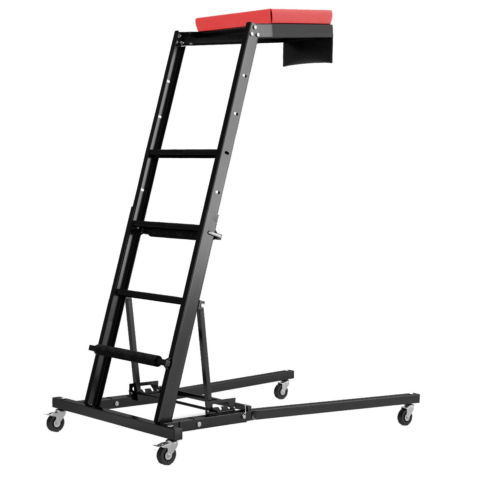 Mit einer Höhenverstellung von 114,5 bis 168 cm und einer 3-Gang-Winkelverstellung passt sich die Hebebühne an verschiedene Fahrzeuggrößen und persönliche Komfortwünsche an. Der robuste Metallrahmen gewährleistet eine hohe Tragfähigkeit von 180 kg, während der H-förmige Sockel für maximale Stabilität sorgt. Die Manövrierfähigkeit ist dank der 4 leichtgängigen PP-Räder, von denen 2 für eine sichere Positionierung feststellbar sind, ein Kinderspiel. Darüber hinaus lässt sich der Aufsatz für zusätzlichen Komfort platzsparend zusammenklappen. Diese Hebebühne ist die professionelle Wahl für effizientes und komfortables Arbeiten am Fahrzeug.